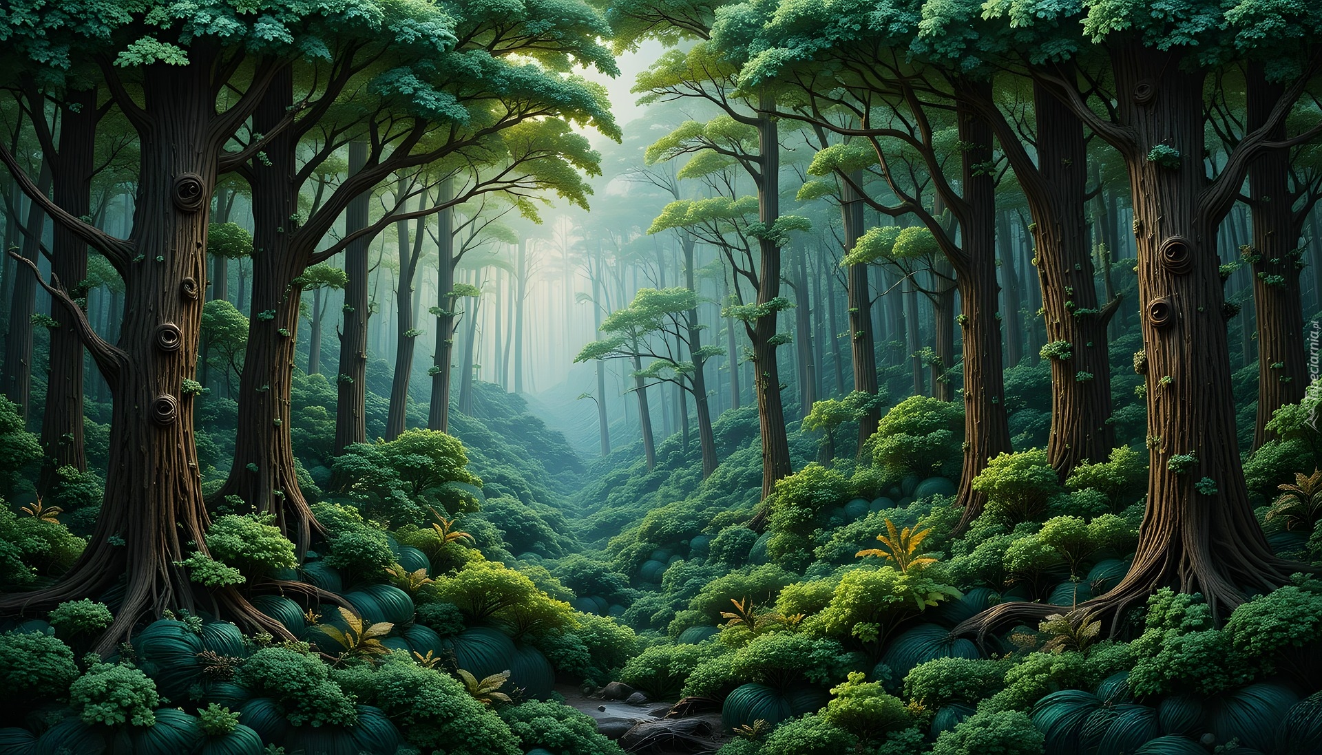 Edytor tapety: Drzewa i roślinność w rozświetlonym lesie
