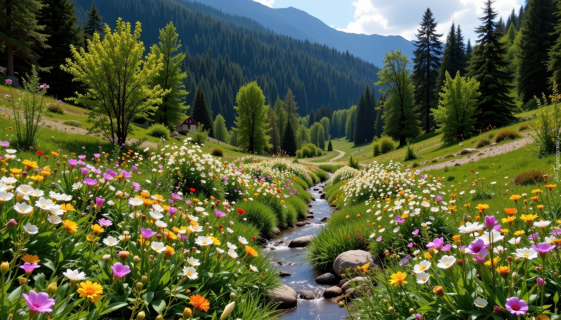 Edytor tapety: Polne kwiaty nad strumieniem w dolinie