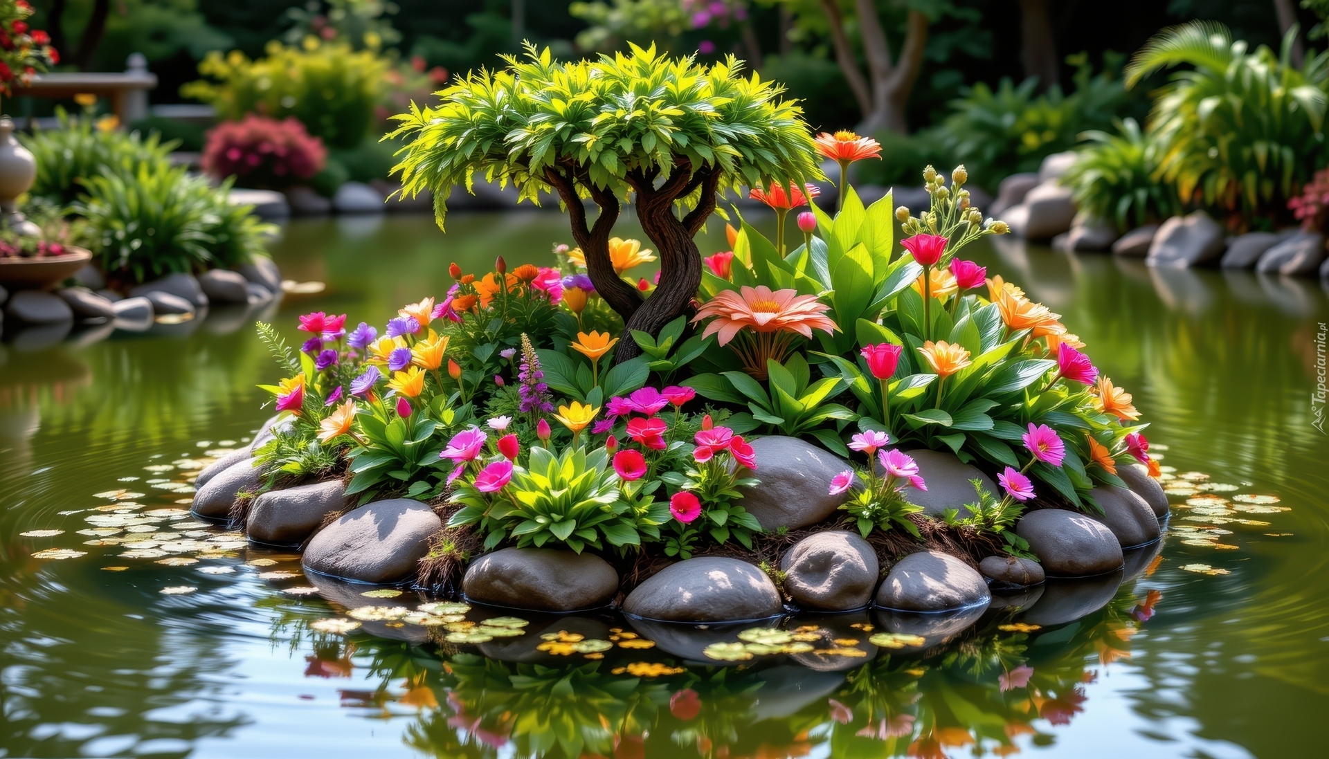 Edytor tapety: Kamienna wysepka z kwiatami w ogrodowym stawie