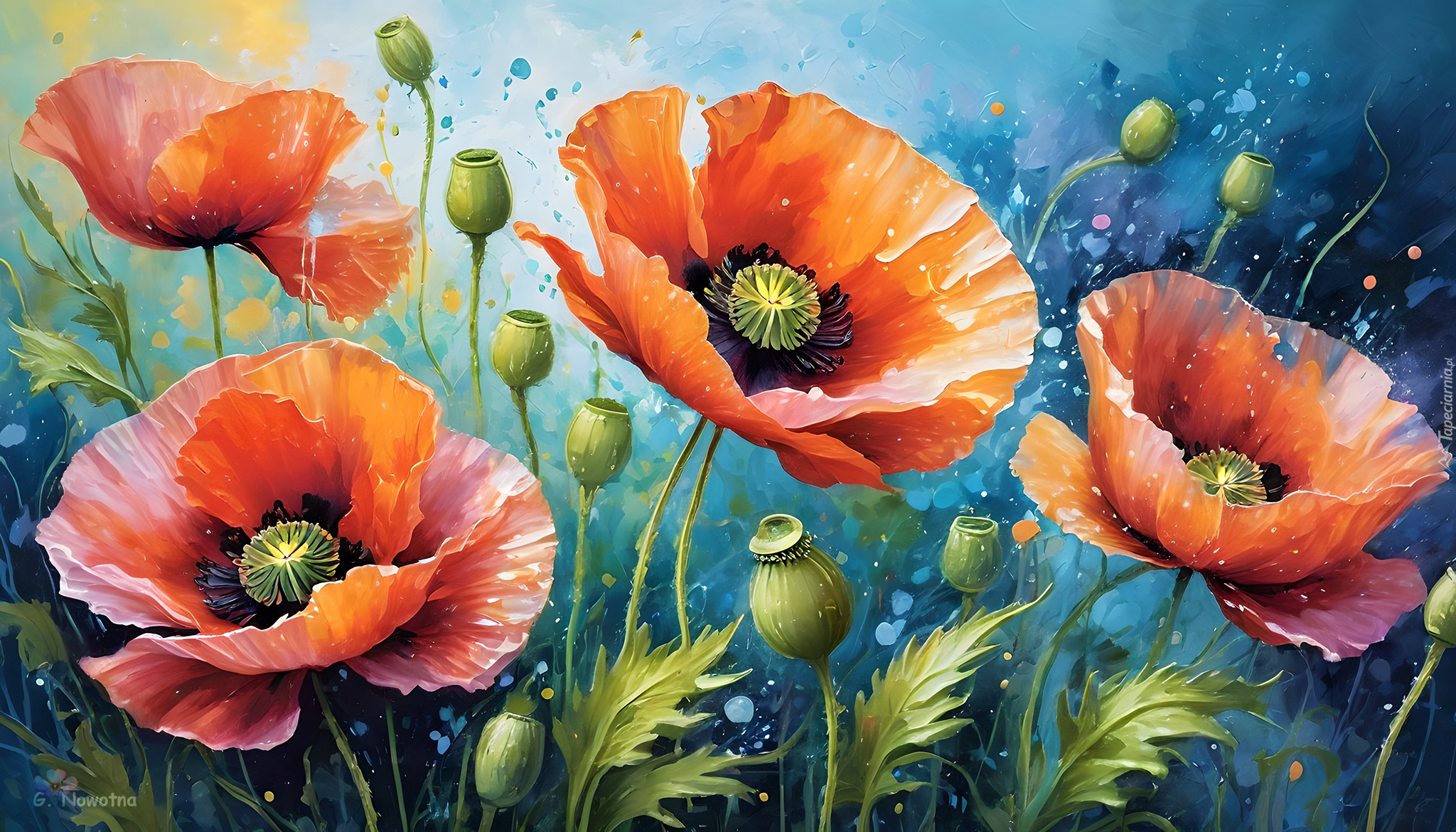Edytor tapety: Rozkwitnięte czerwone maki z makówkami w grafice