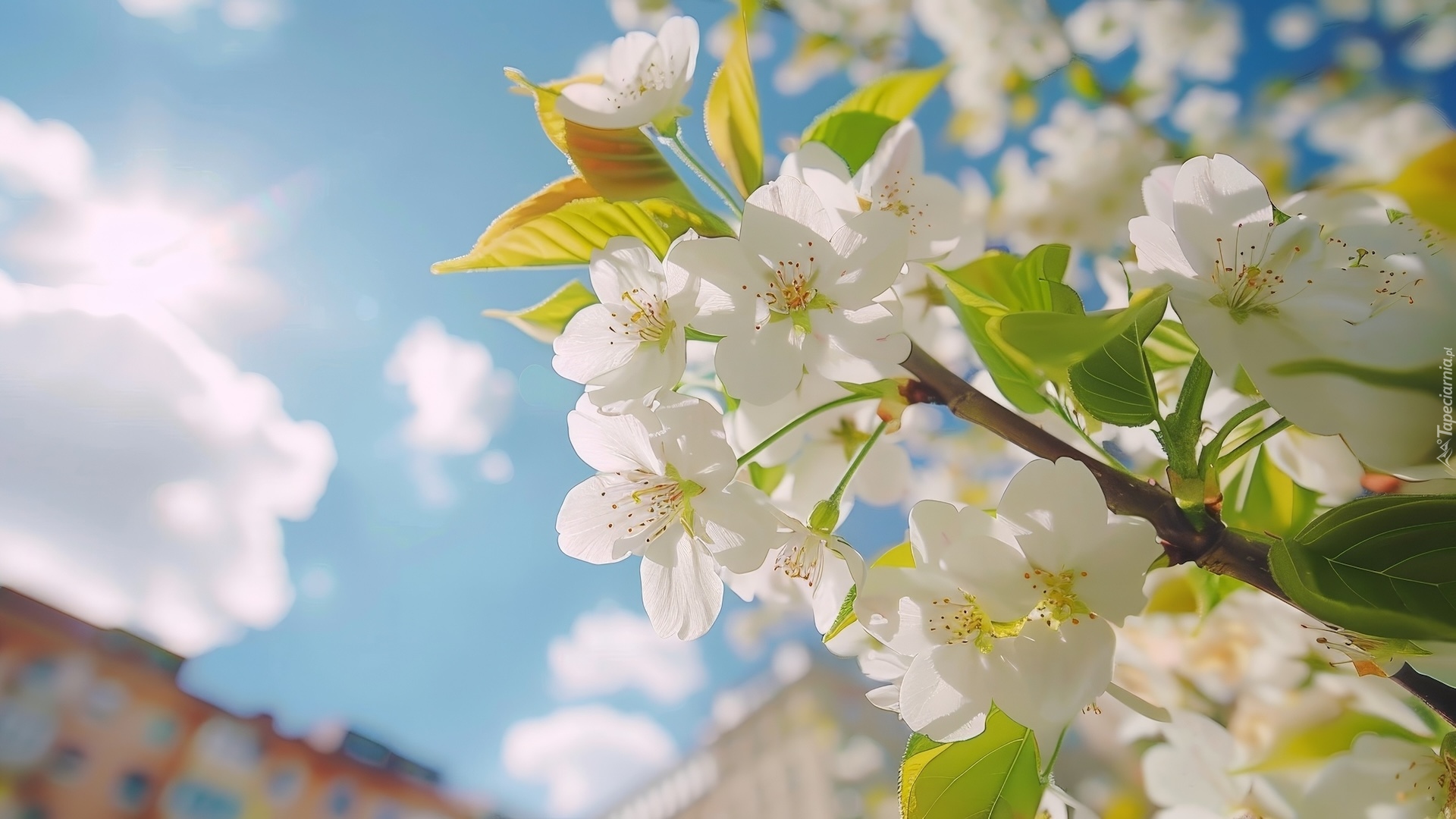 Edytor tapety: Gałązka drzewa owocowego z białymi kwiatami