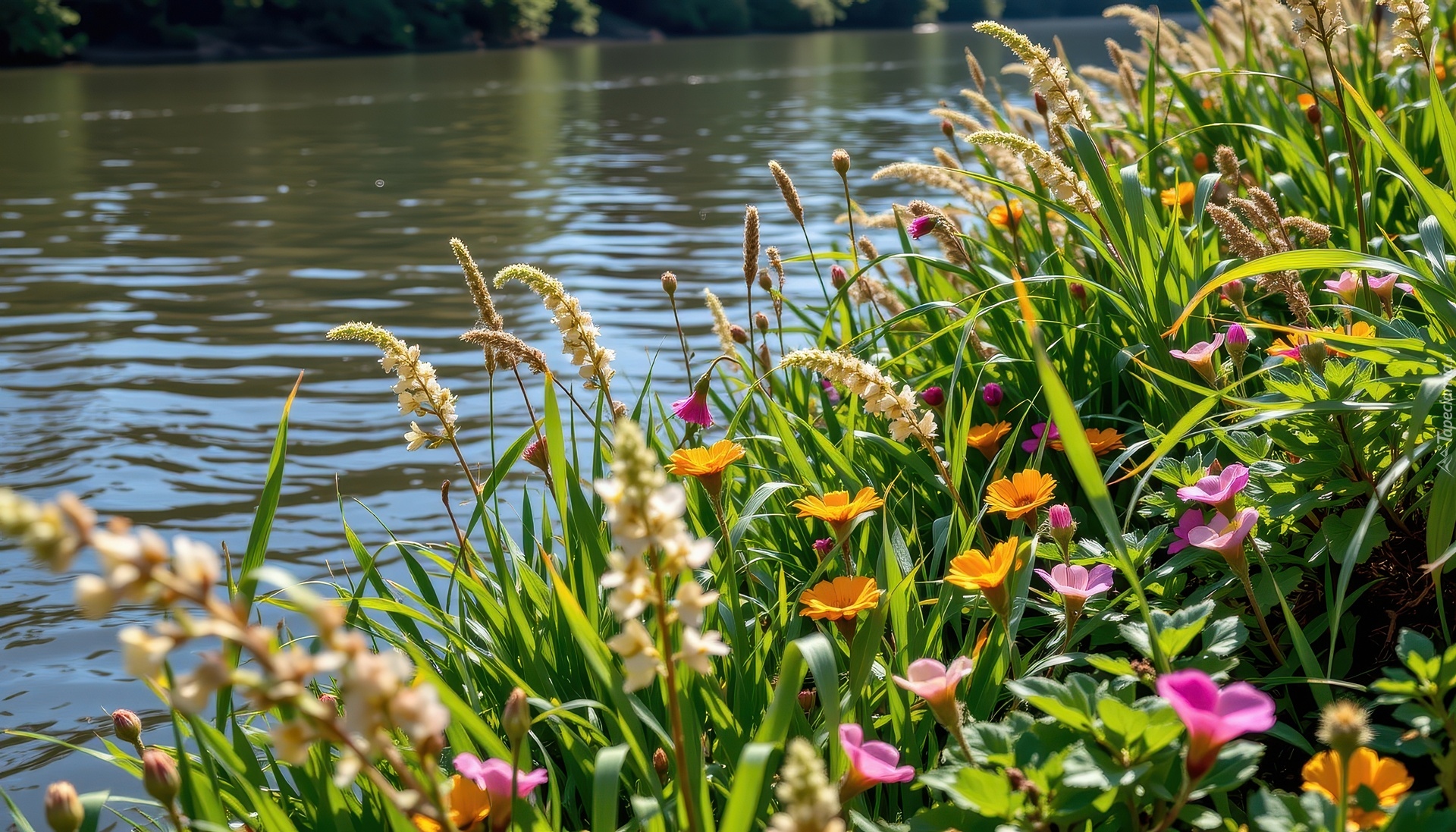 Edytor tapety: Trawa i kwiaty na brzegu rzeki