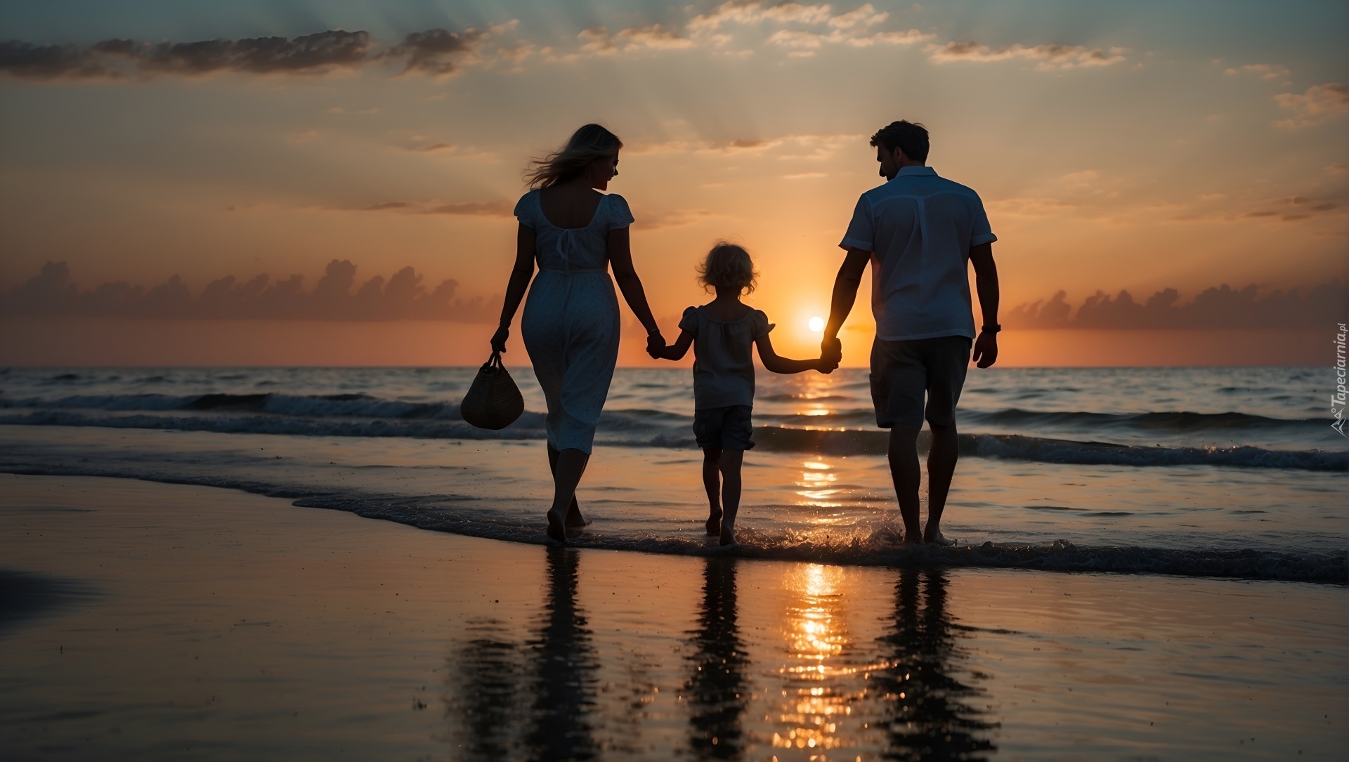 Edytor tapety: Rodzina na brzegu morza o zachodzie słońca