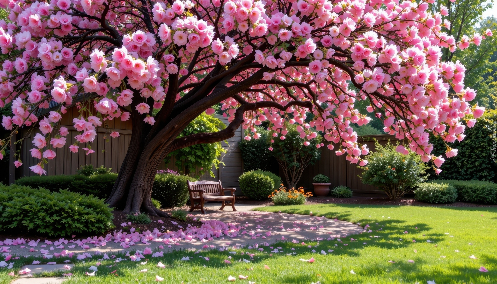 Edytor tapety: Ukwiecone różowymi kwiatami drzewo