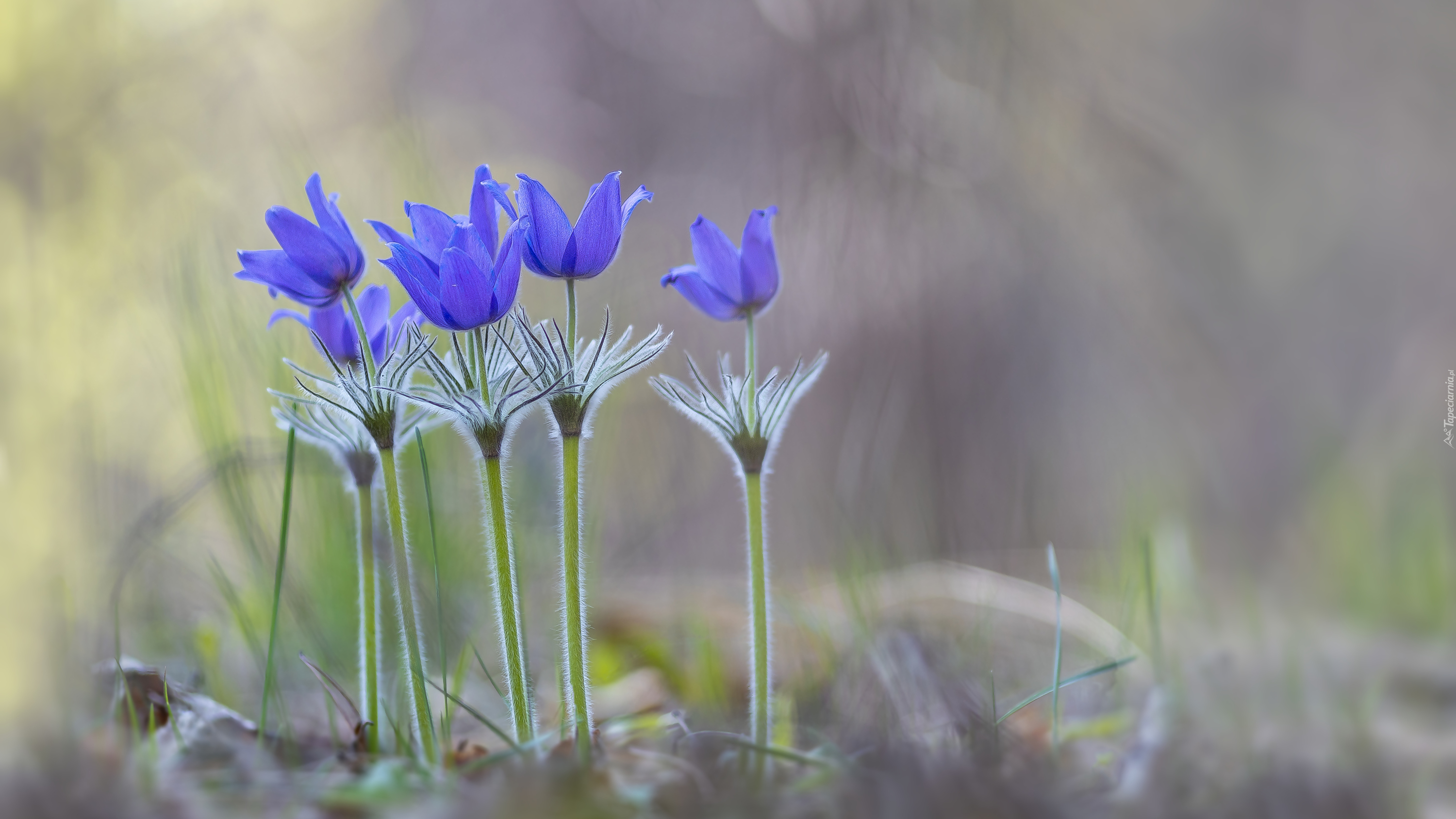 Edytor tapety: Kwitnące niebieskie sasanki na rozmytym tle