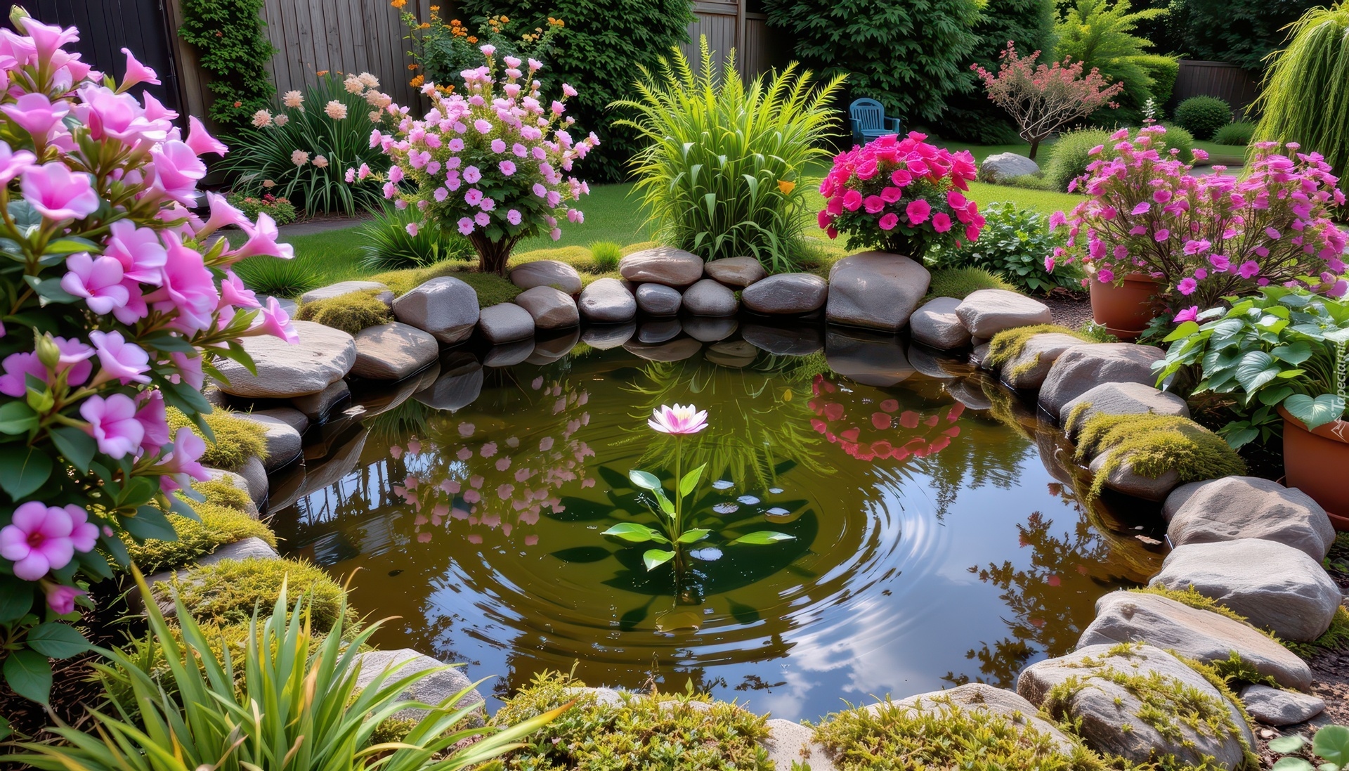 Edytor tapety: Kamienna sadzawka z kolorowymi kwiatami w ogrodzie