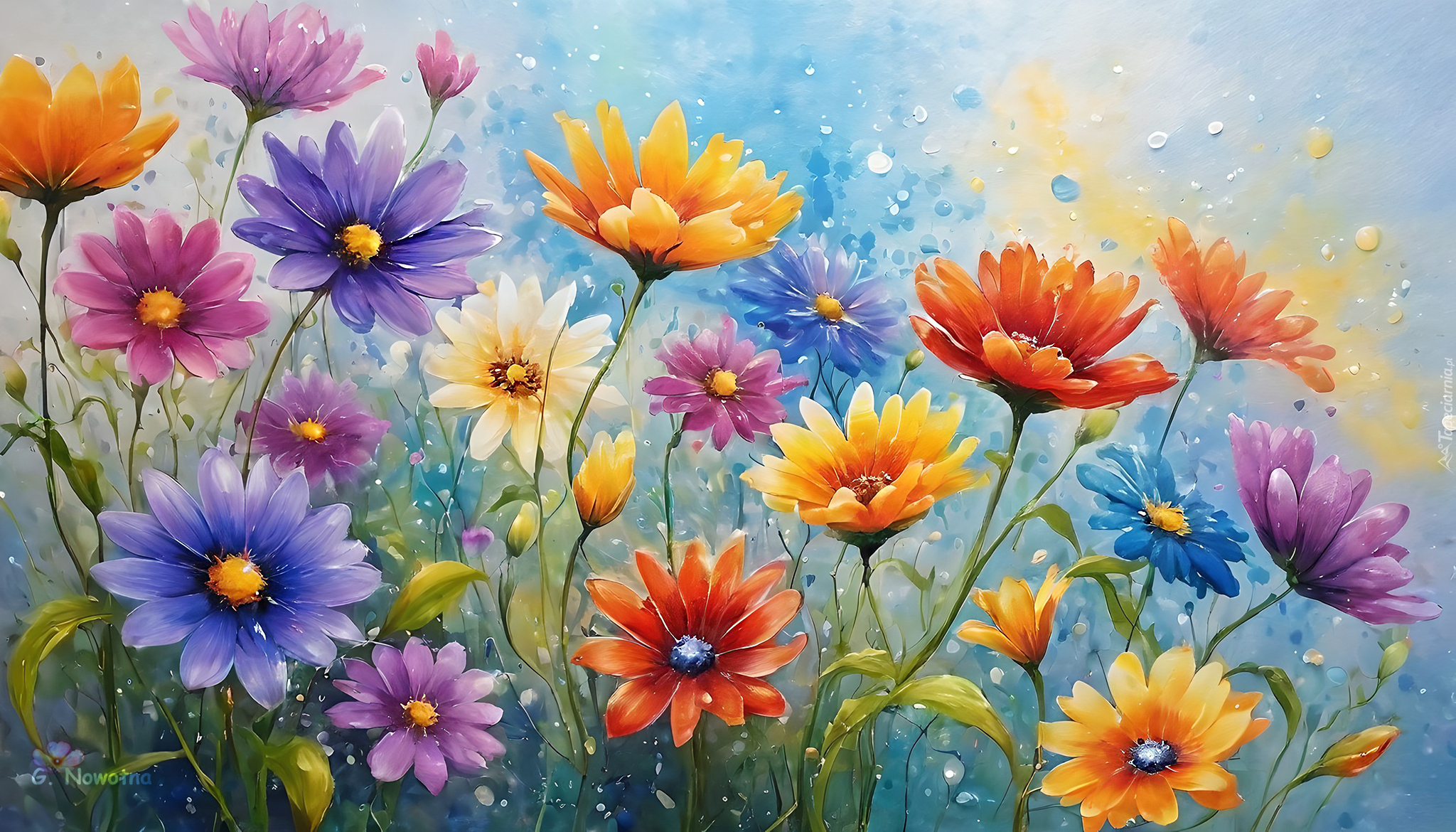 Edytor tapety: Kolorowe kwiaty z kroplami wody w grafice