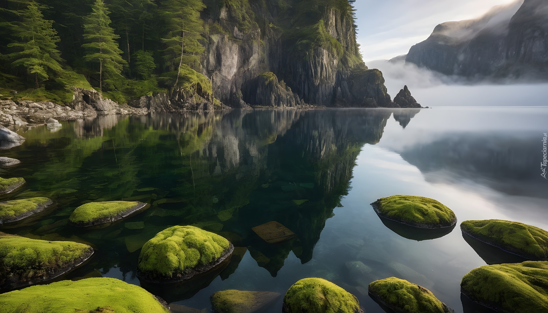 Edytor tapety: Omszałe kamienie i mgła nad górskim jeziorem
