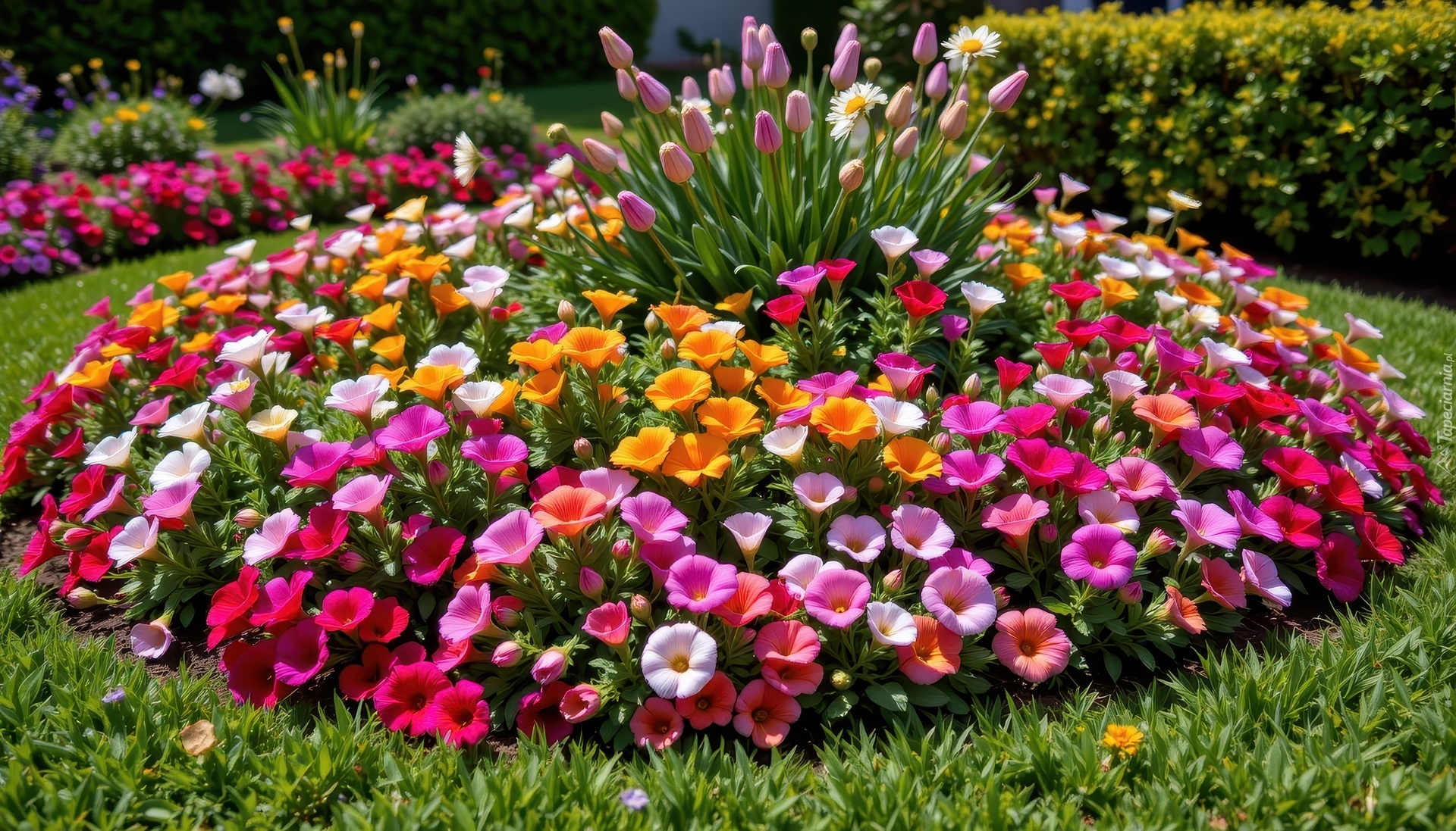 Edytor tapety: Klomb z kolorowymi kwiatami w ogrodzie