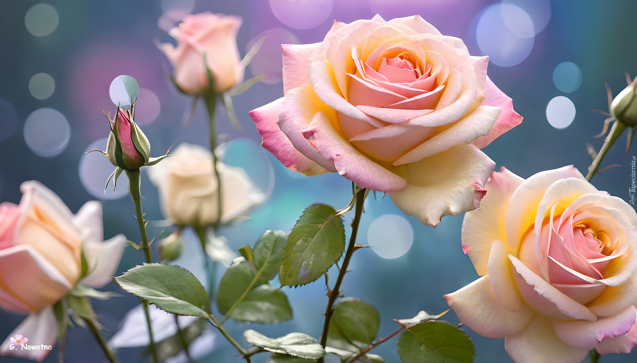 Edytor tapety: Jasnoróżowe rozkwitnięte róże z pąkami w grafice
