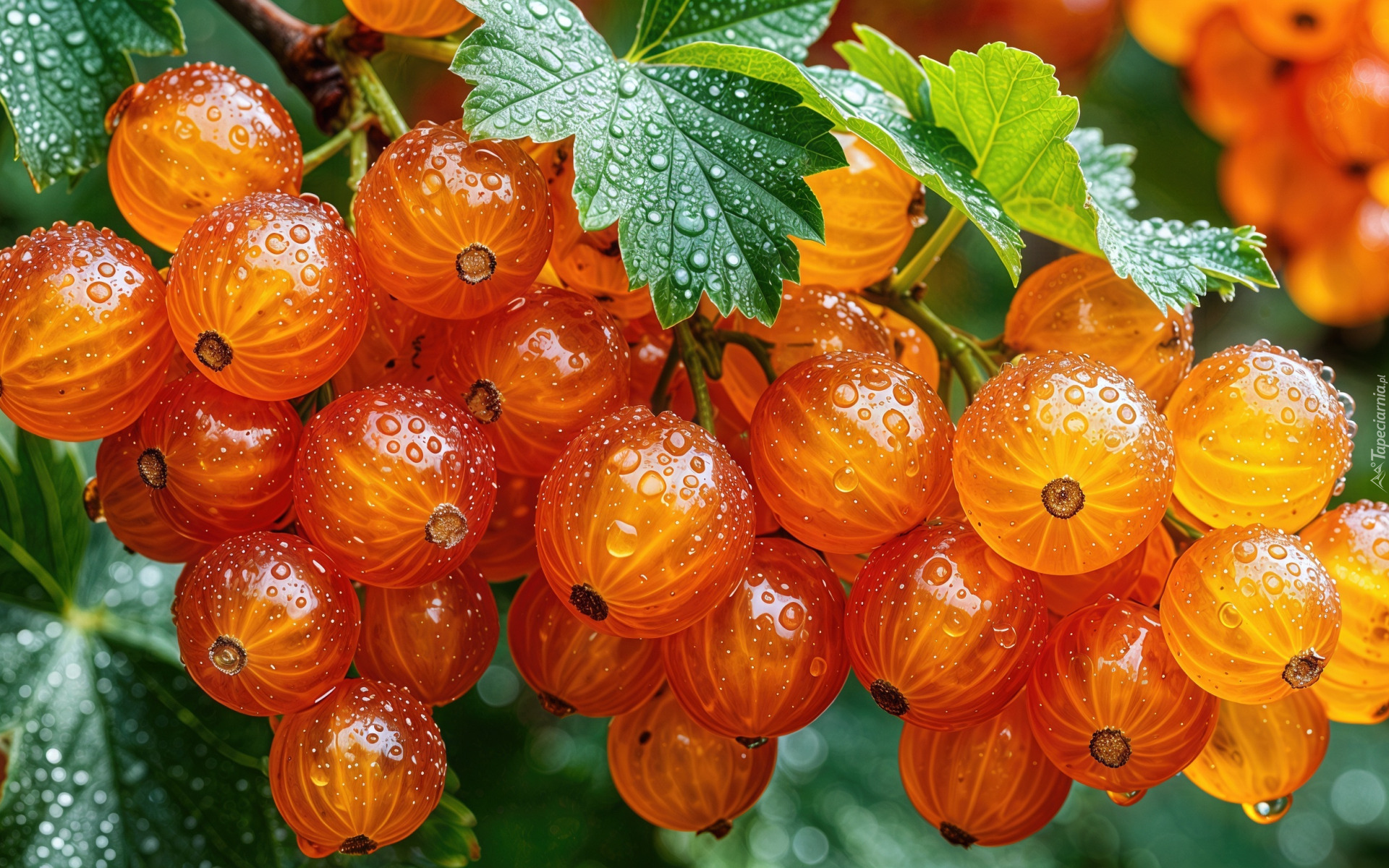 Edytor tapety: Czerwone dojrzałe owoce porzeczki z kropelkami