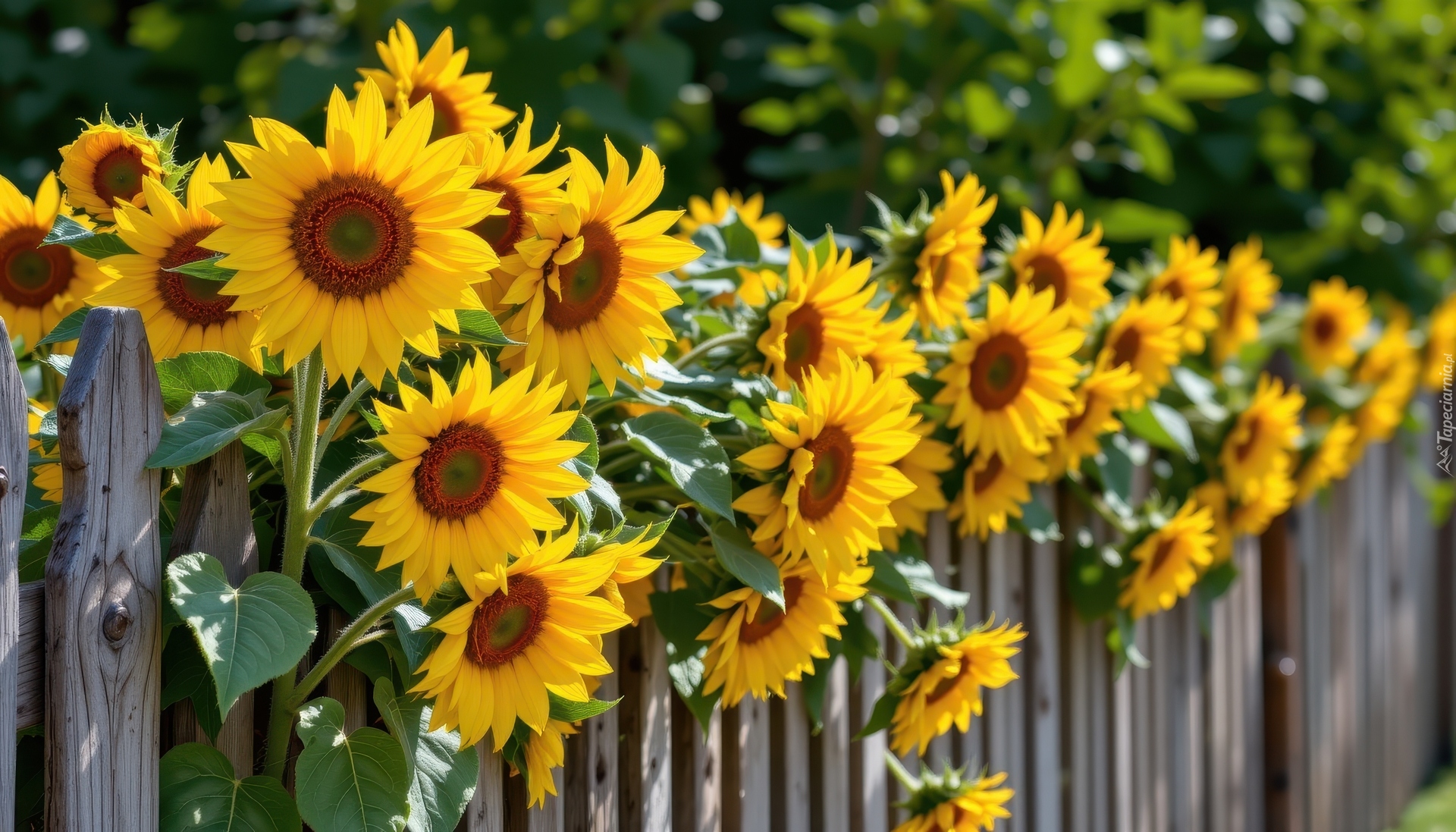 Edytor tapety: Rozświetlone światłem słoneczniki przy drewnianym płocie