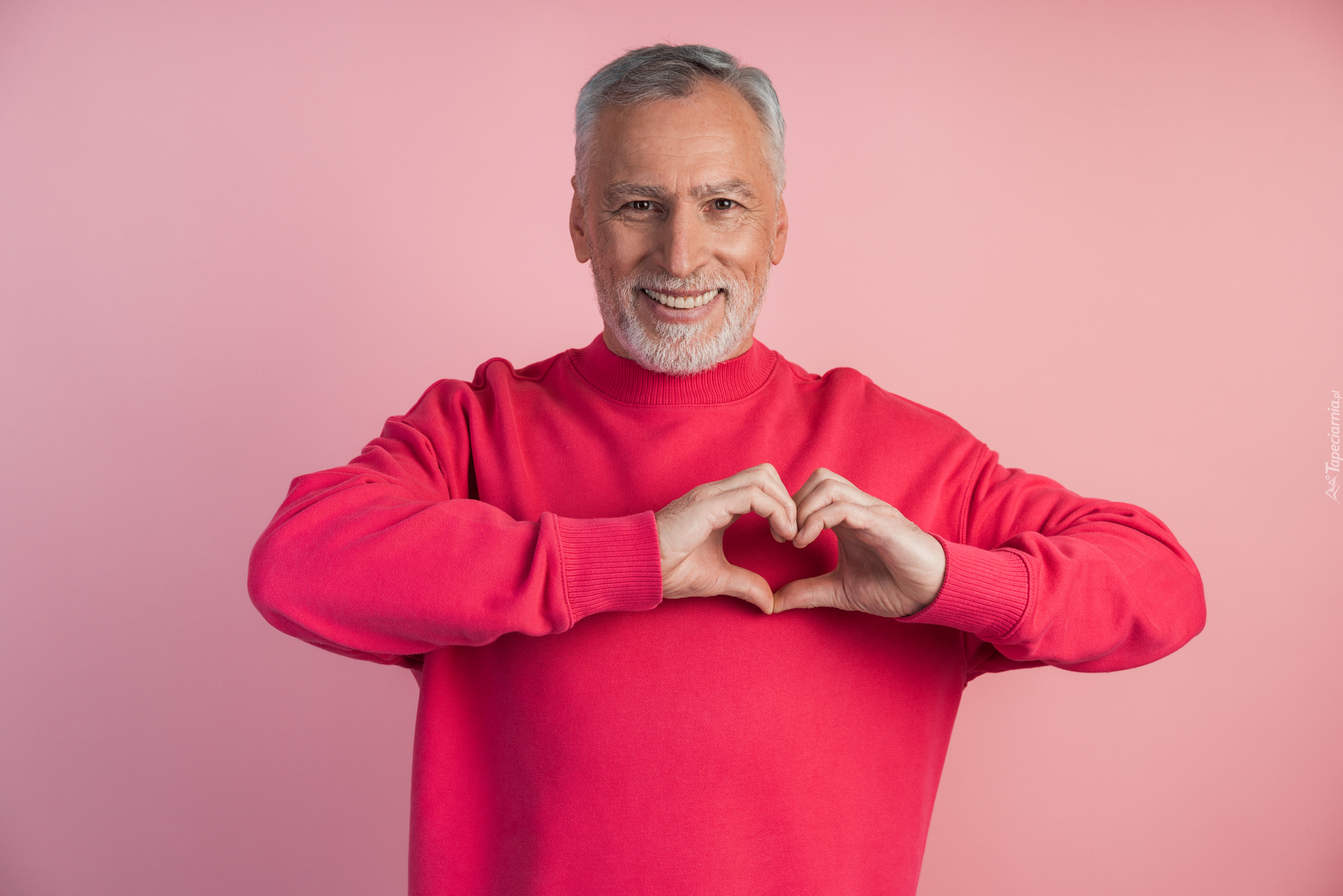 Edytor tapety: Uśmiechnięty mężczyzna w czerwonym swetrze z gestem serduszka