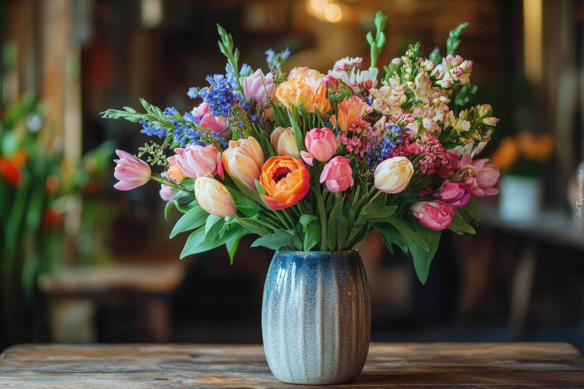 Edytor tapety: Bukiet kolorowych kwiatów w wazonie na stole drewnianym