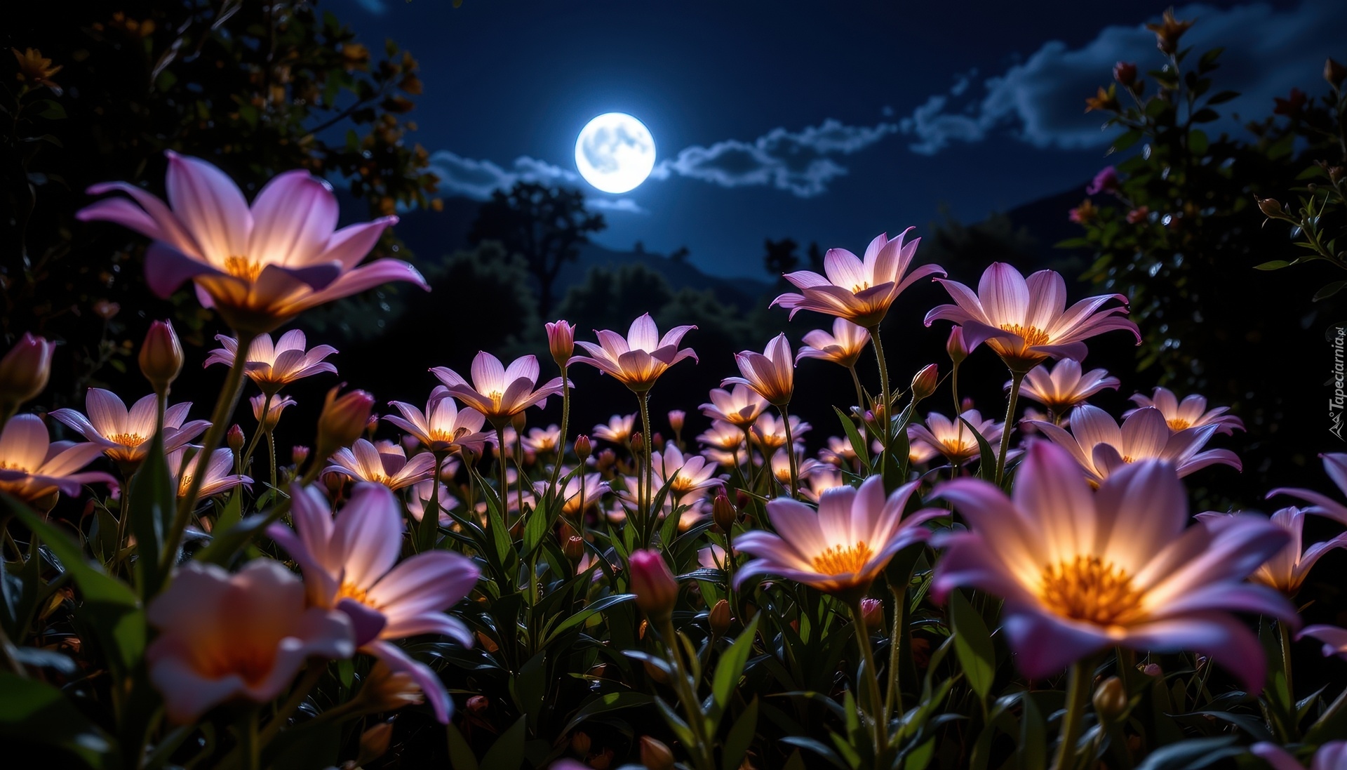 Edytor tapety: Księżyc nad podświetlanymi kwiatami w ogrodzie
