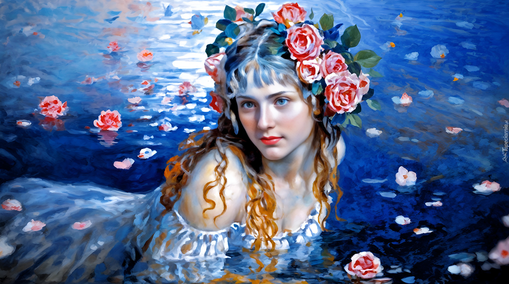 Edytor tapety: Kobieta z kwiatami we włosach leżąca w wodzie