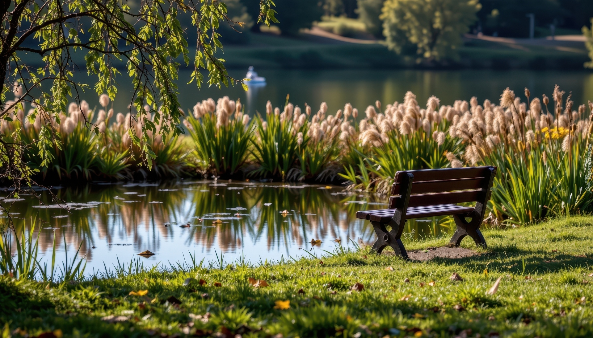 Edytor tapety: Ławka obok małego stawu otoczonego trzcinami