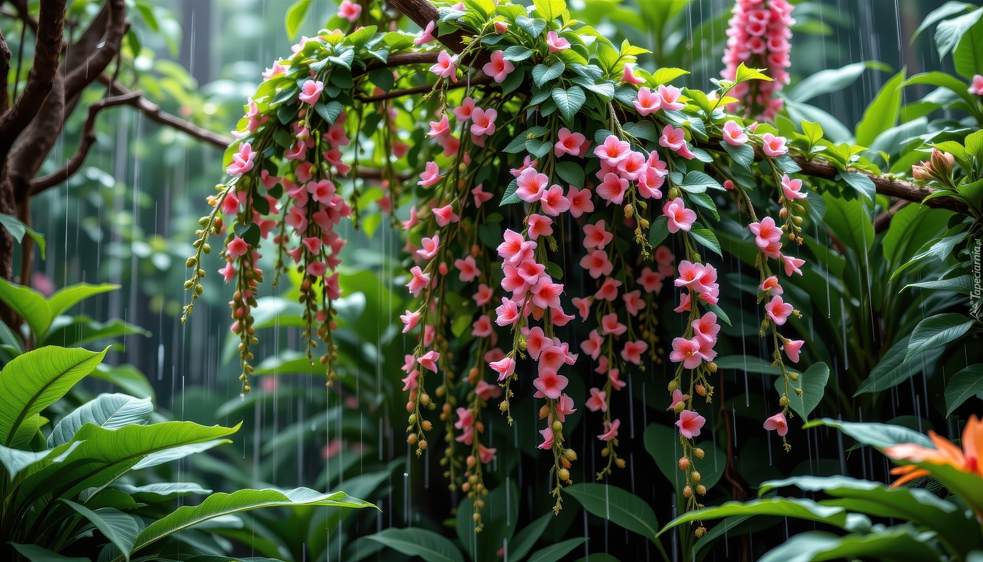 Edytor tapety: Zwisające różowe kwiaty i liście w padającym deszczu
