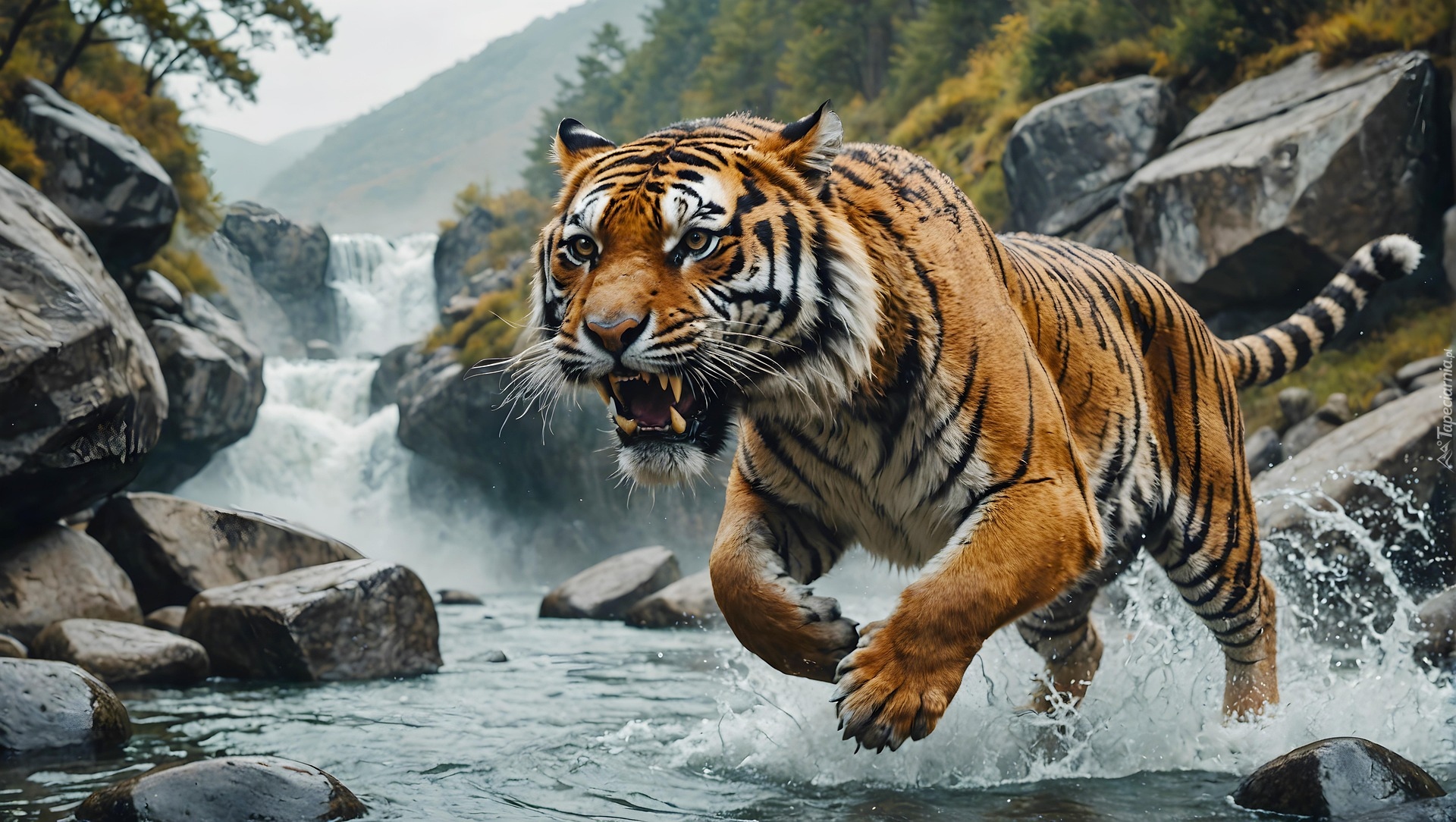Edytor tapety: Skok tygrysa w kamienistej rzece