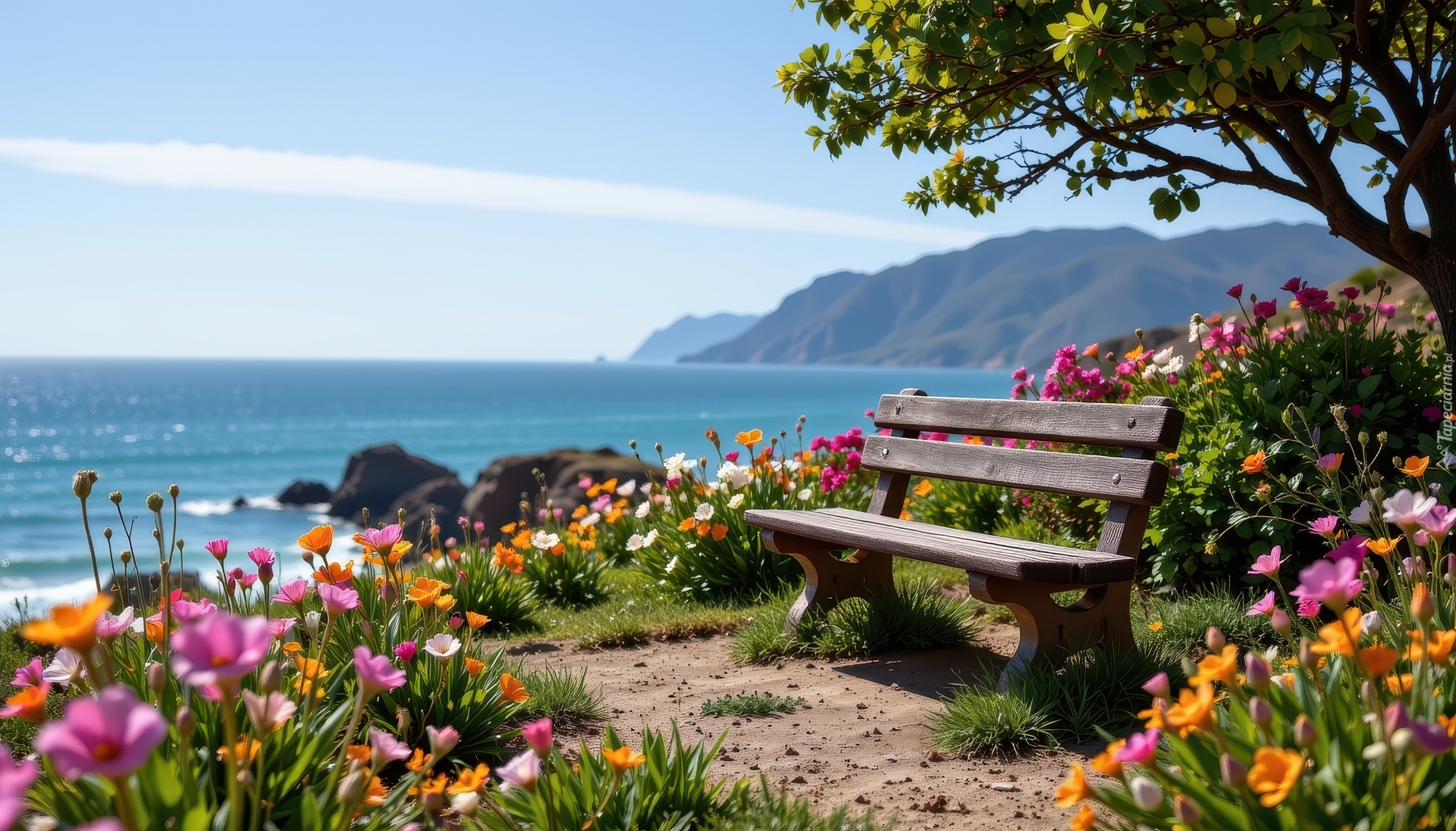 Edytor tapety: Ławka nad morzem wśród kolorowych kwiatów pod drzewem