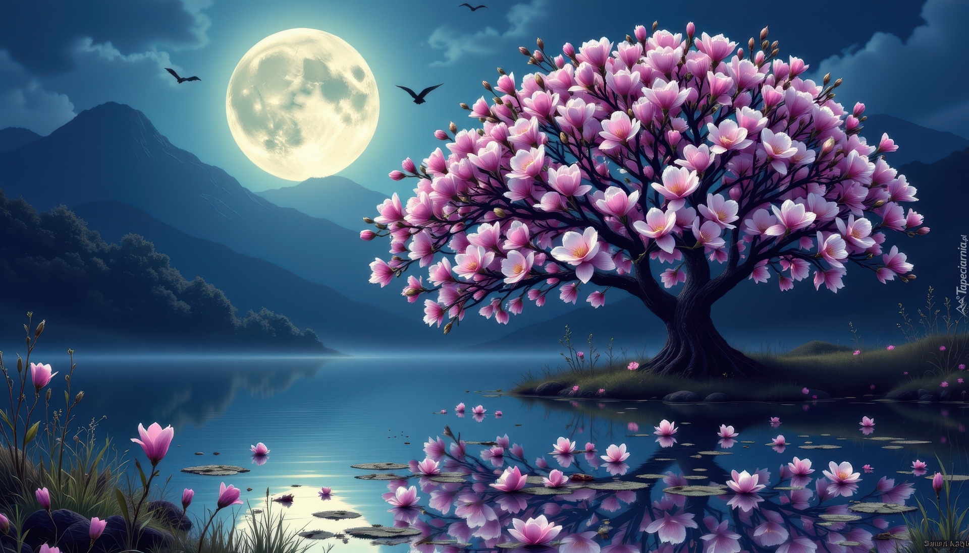 Edytor tapety: Kwitnące drzewo nad górskim jeziorem w blasku księżyca
