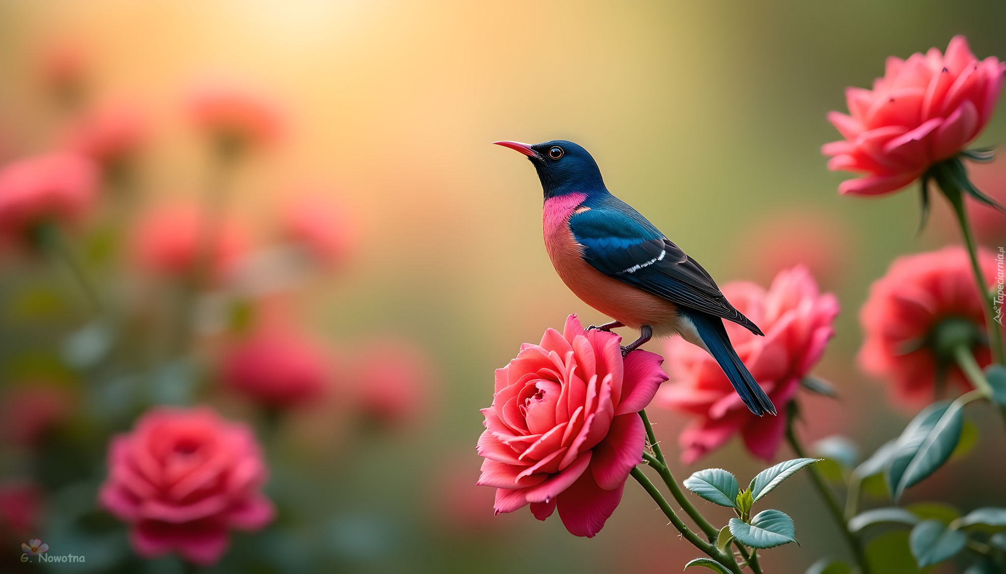 Edytor tapety: Kolorowy ptak siedzący na rozwiniętym kwiecie róży