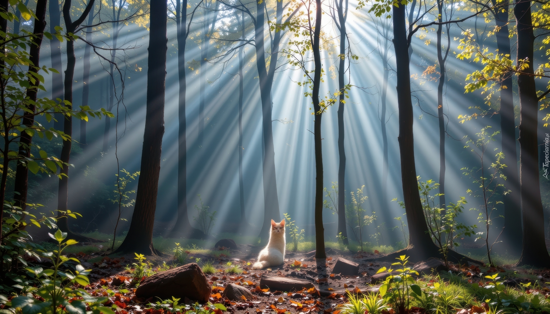 Edytor tapety: Lis pomiędzy rozświetlonymi słońcem drzewami w lesie