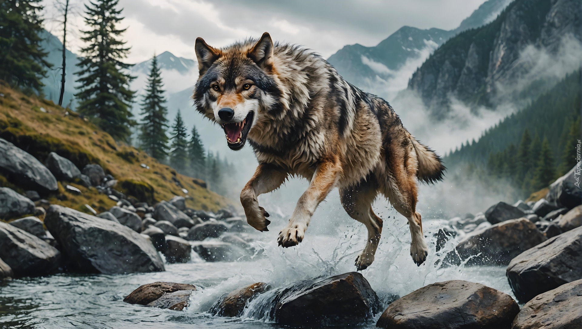 Edytor tapety: Wilk skaczący po kamieniach w górskim potoku
