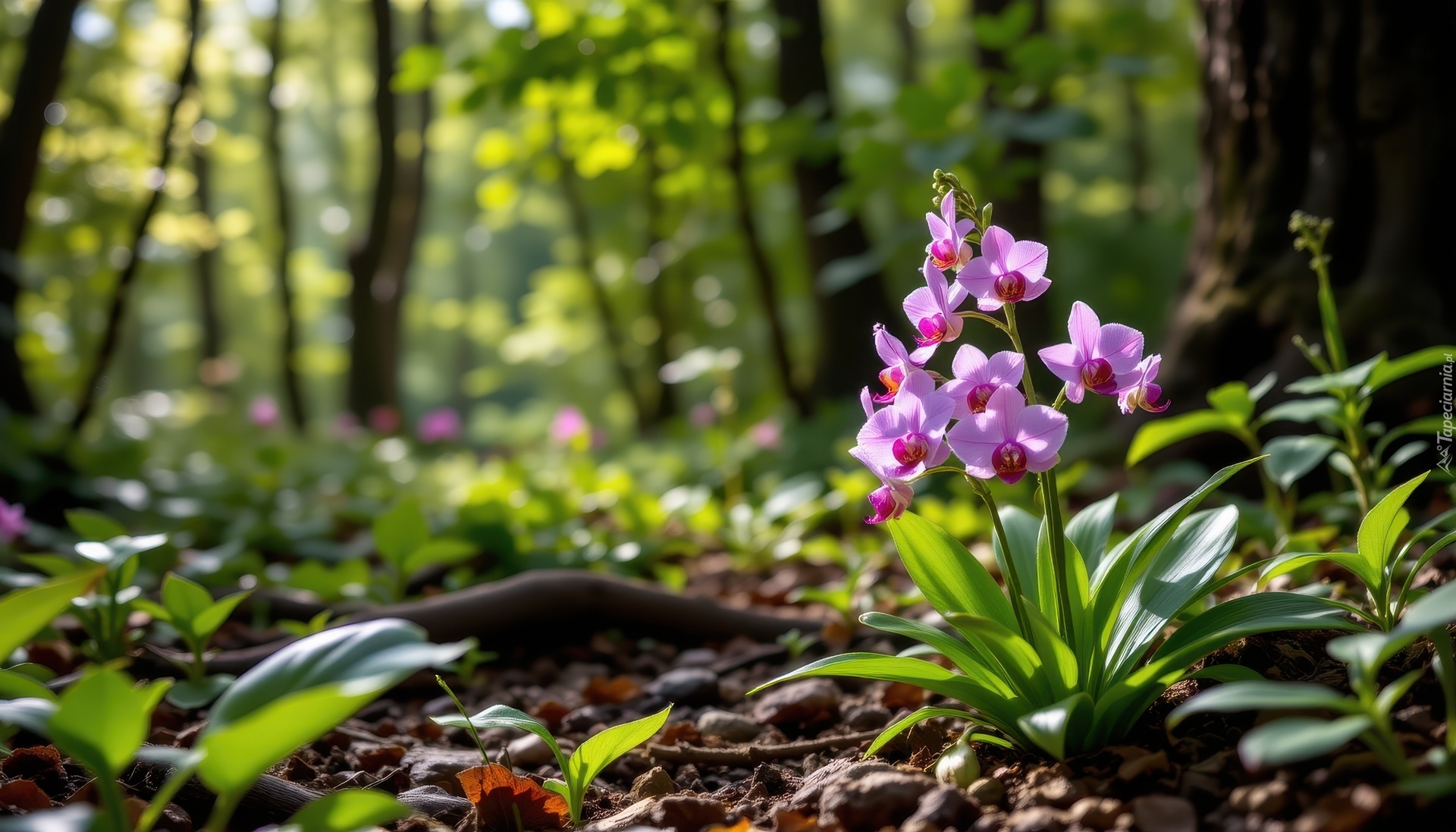 Edytor tapety: Rozświetlone różowe storczyki pod drzewami