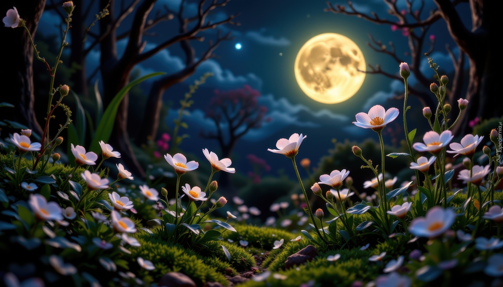 Edytor tapety: Kwiaty i drzewa w blasku księżyca w pełni