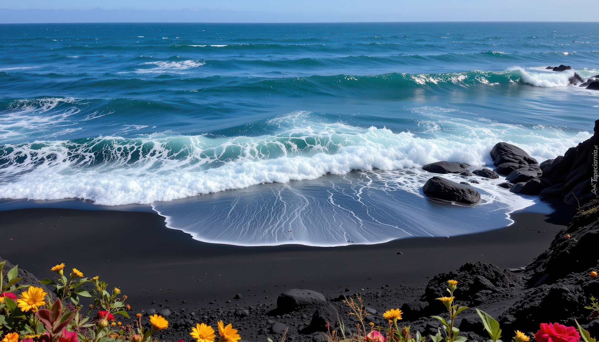 Edytor tapety: Kwiaty przy plaży i fale na morzu