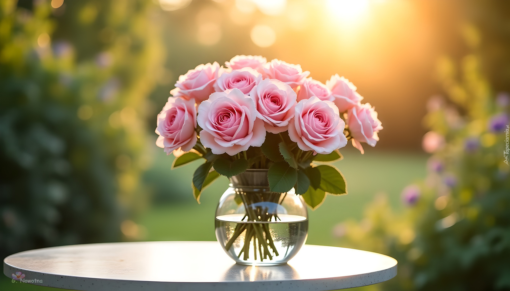 Edytor tapety: Róże w szklanym wazonie na okrągłym stoliku