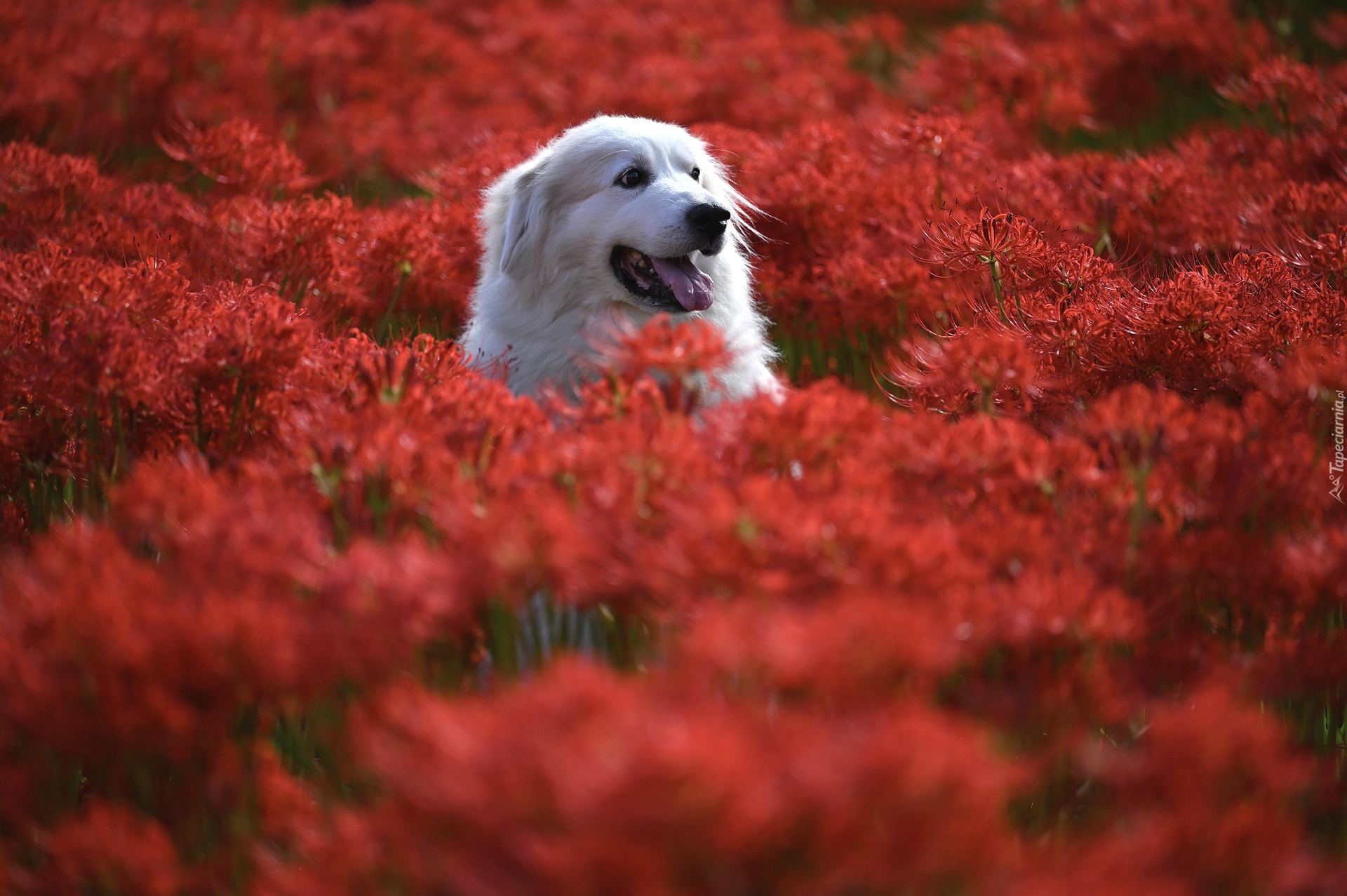 Edytor tapety: Biały pies wśród czerwonych kwiatów