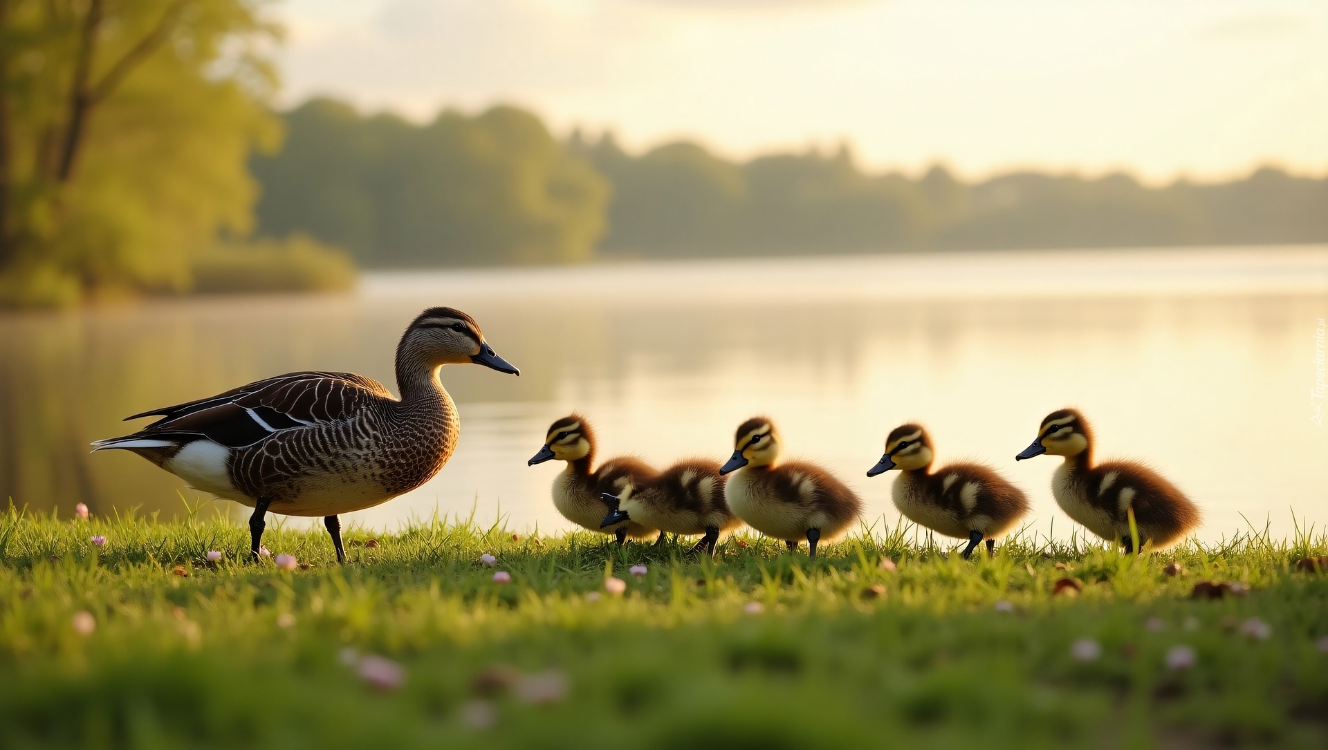 Edytor tapety: Kaczka z kaczuszkami nad stawem