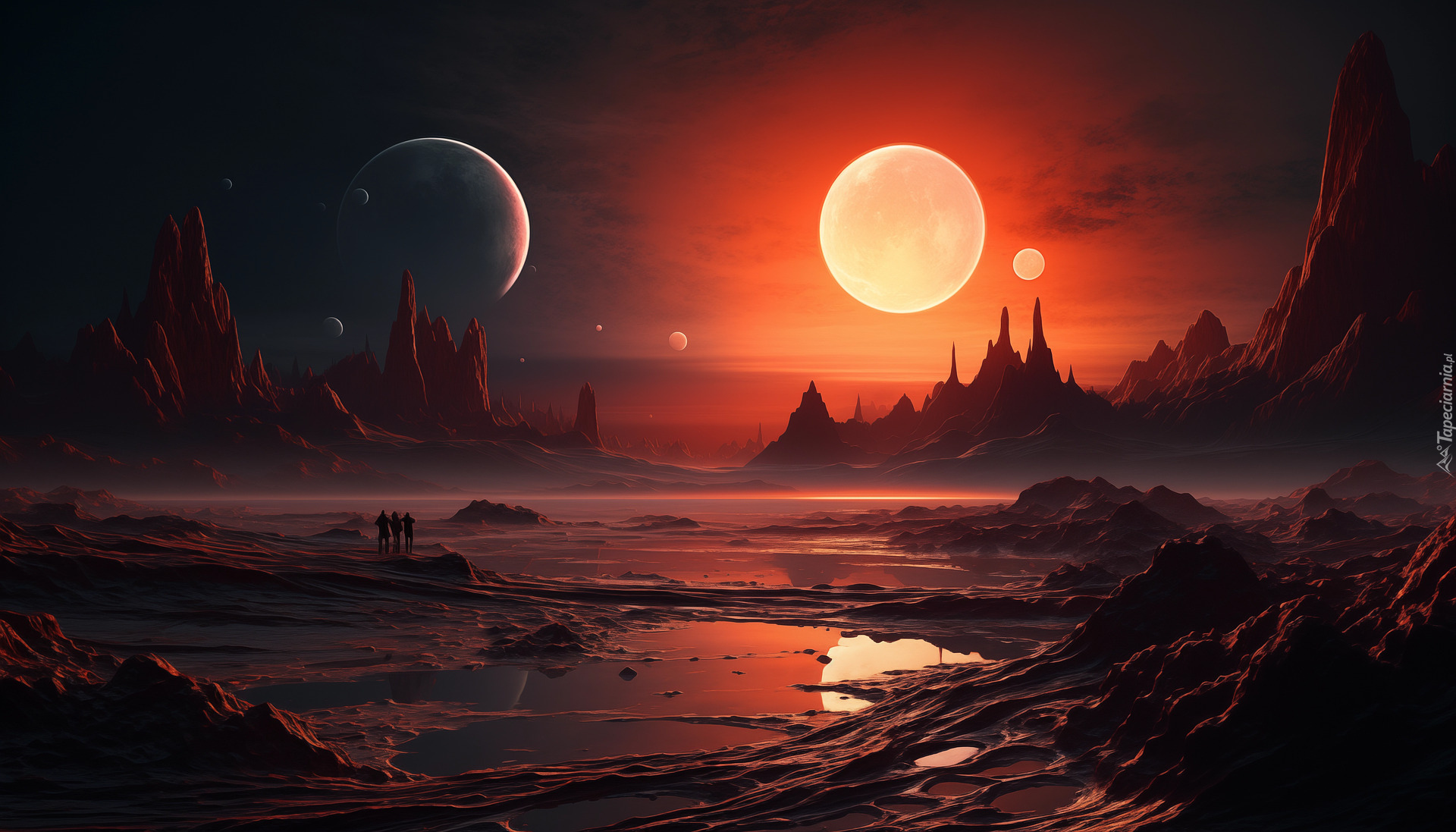 Edytor tapety: Księżyc i planety nad górami w grafice fantasy