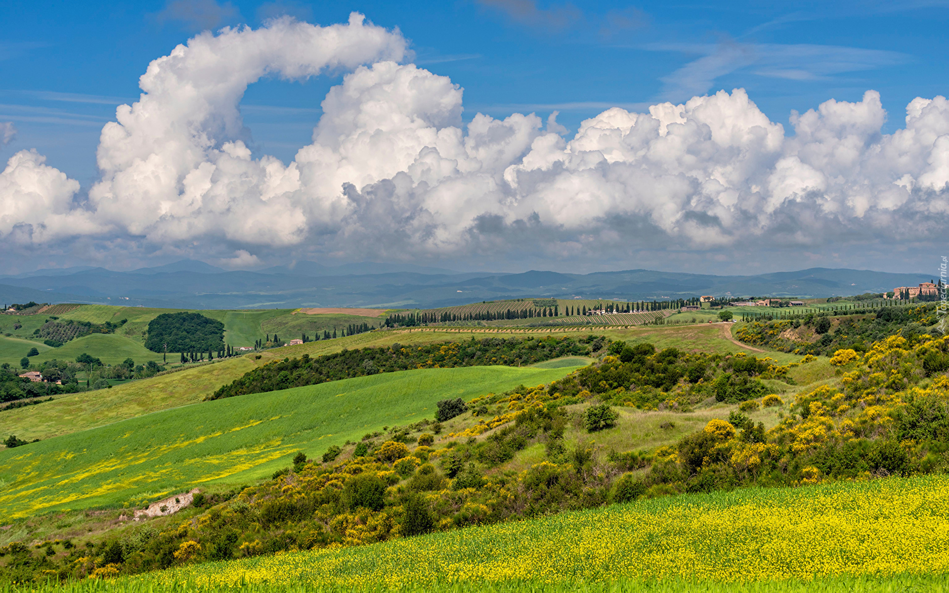 Edytor tapety: Białe obłoki nad zielonymi wzgórzami Toskanii