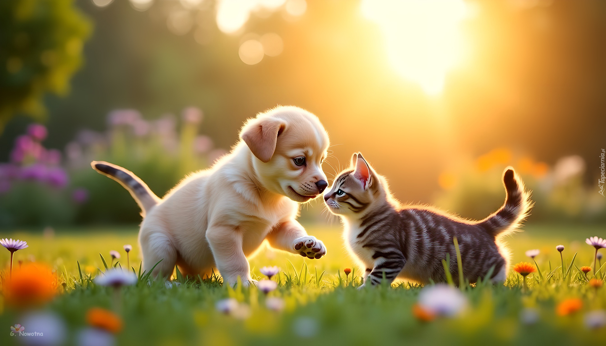 Edytor tapety: Spotkanie szczeniaka i małego kotka na trawie