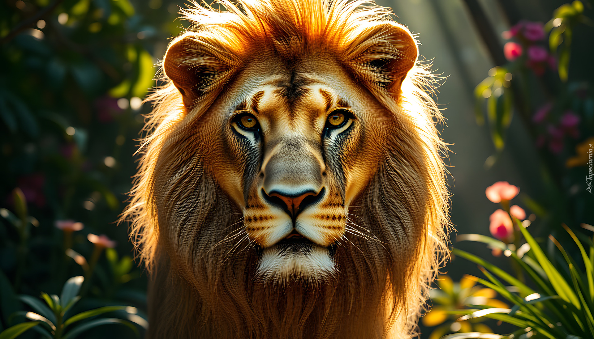 Edytor tapety: Głowa lwa na tle rozświetlonych roślin