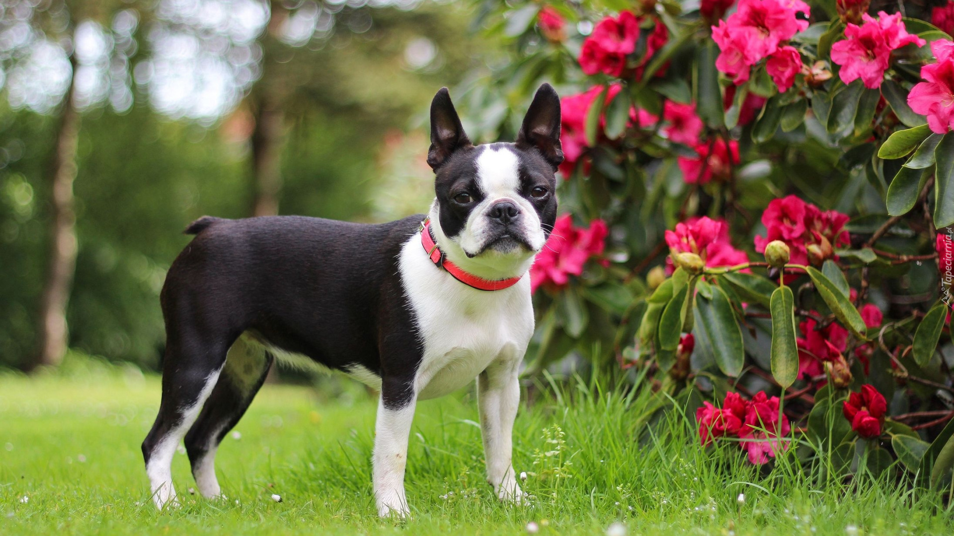 Edytor tapety: Boston terrier obok krzewu rododendronu