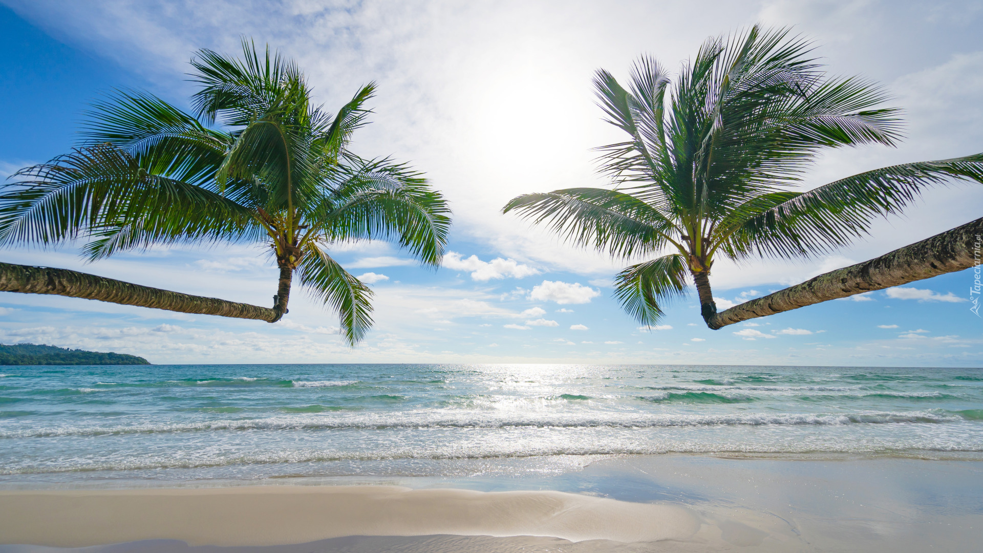 Edytor tapety: Dwie palmy pochylone nad plażą