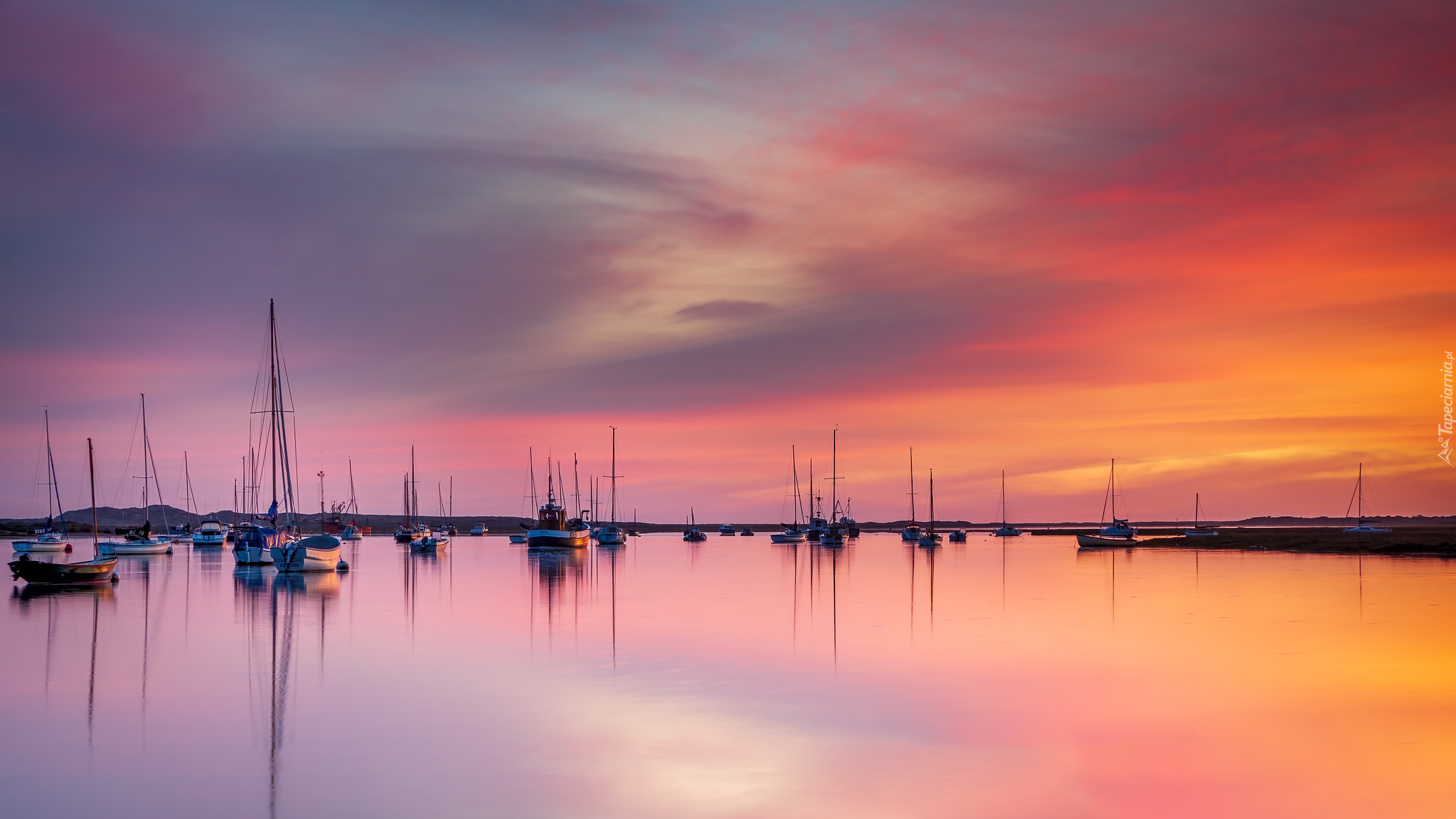 Edytor tapety: Żaglówki w zatoce pod niebem zachodzącego słońca