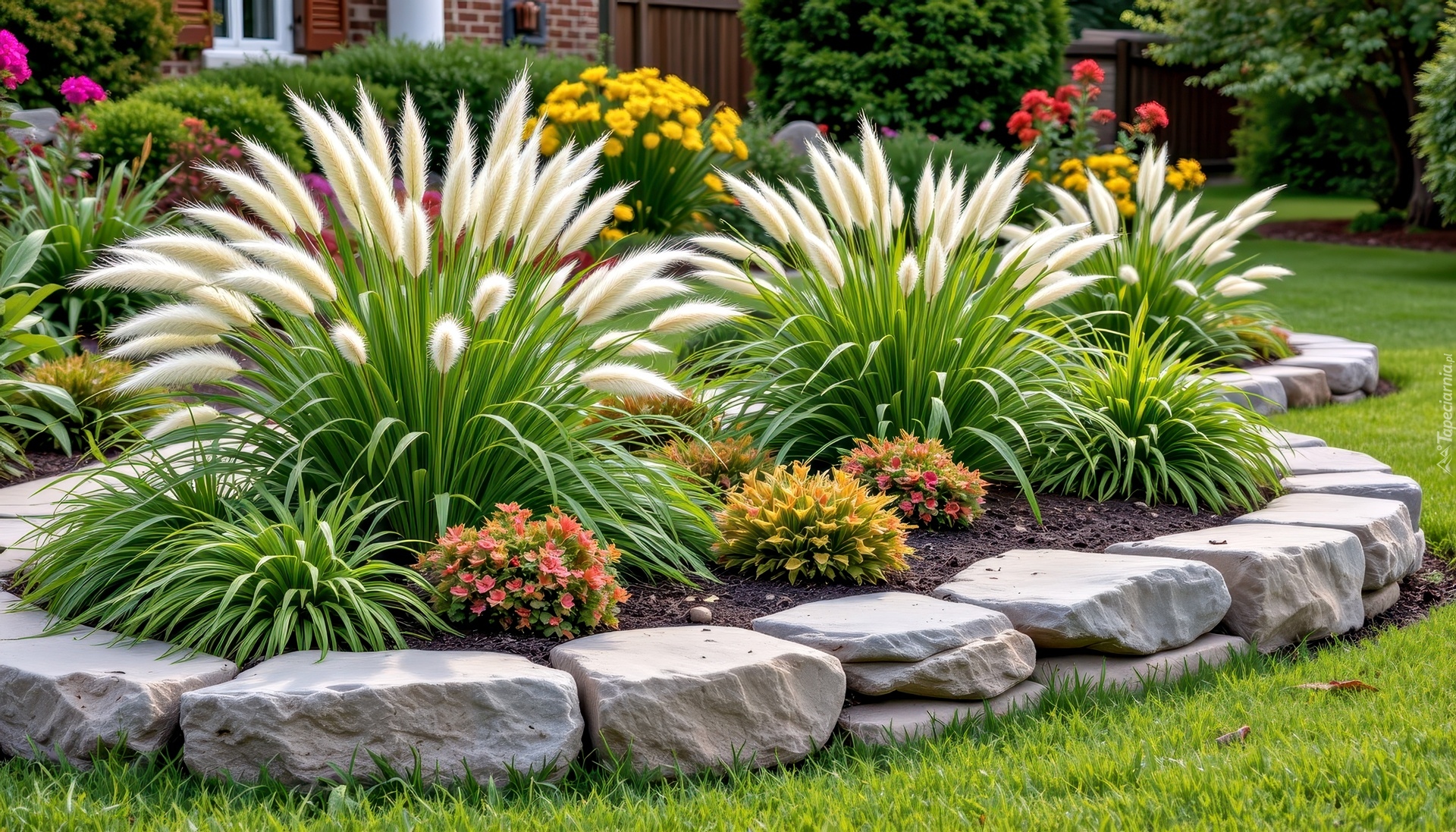 Edytor tapety: Klomb z kwiatami i trawami ozdobnymi w ogrodzie