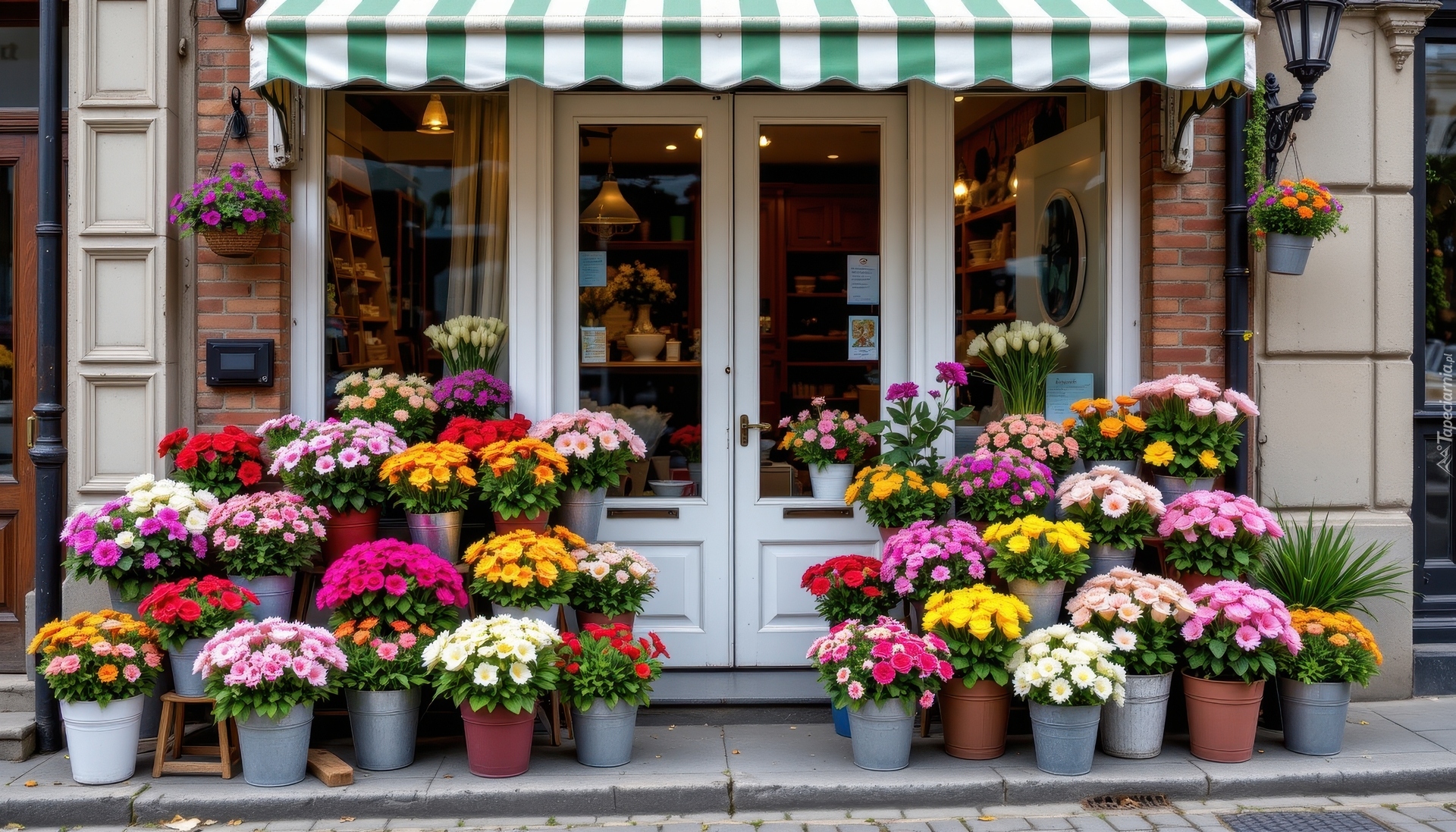 Edytor tapety: Kolorowe kwiaty w donicach na chodniku przed kwiaciarnią