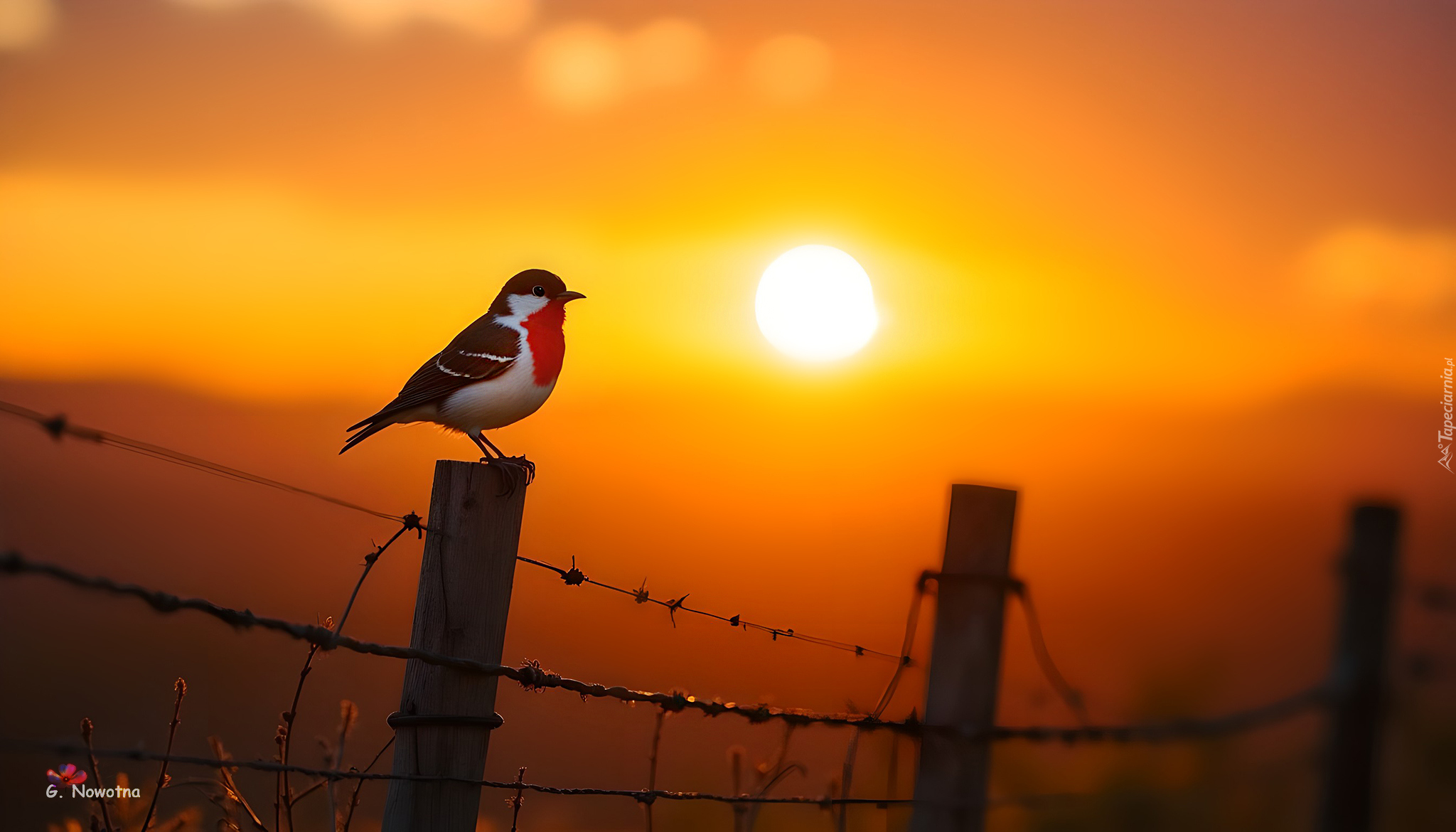 Edytor tapety: Ptak na kołku płotu pod niebem zachodzącego słońca