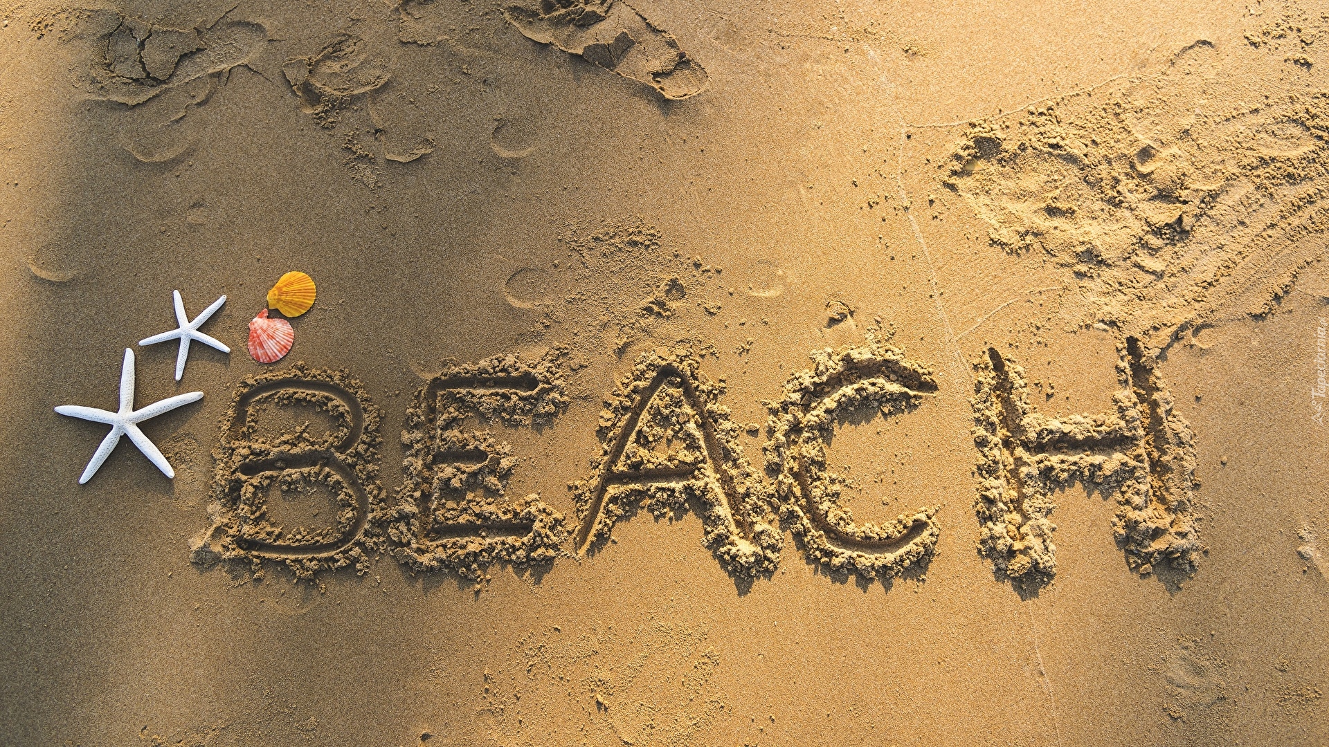 Edytor tapety: Napis Beach na plaży z muszelkami i rozgwiazdami