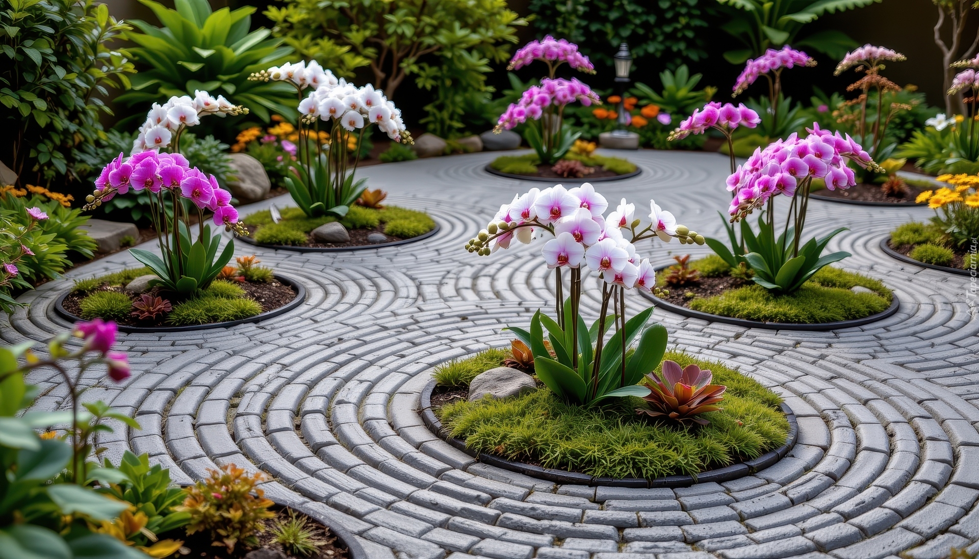 Edytor tapety: Klomby ze storczykami wokół kostki brukowej w ogrodzie