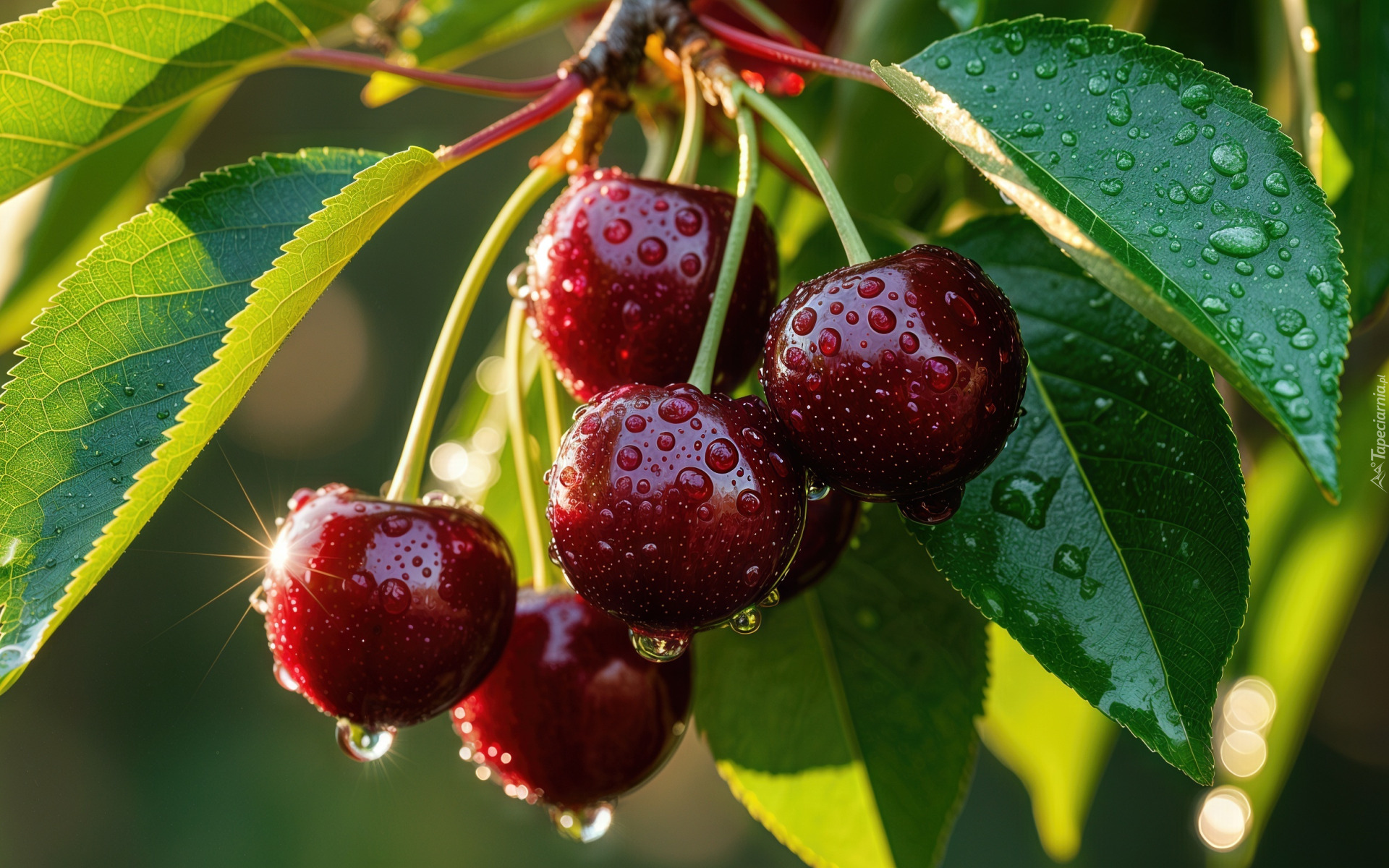 Edytor tapety: Rozświetlone słońcem mokre wiśnie i liście na gałęzi