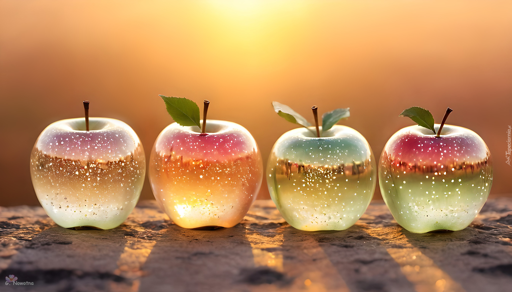 Edytor tapety: Cztery szklane jabłka w słonecznym blasku