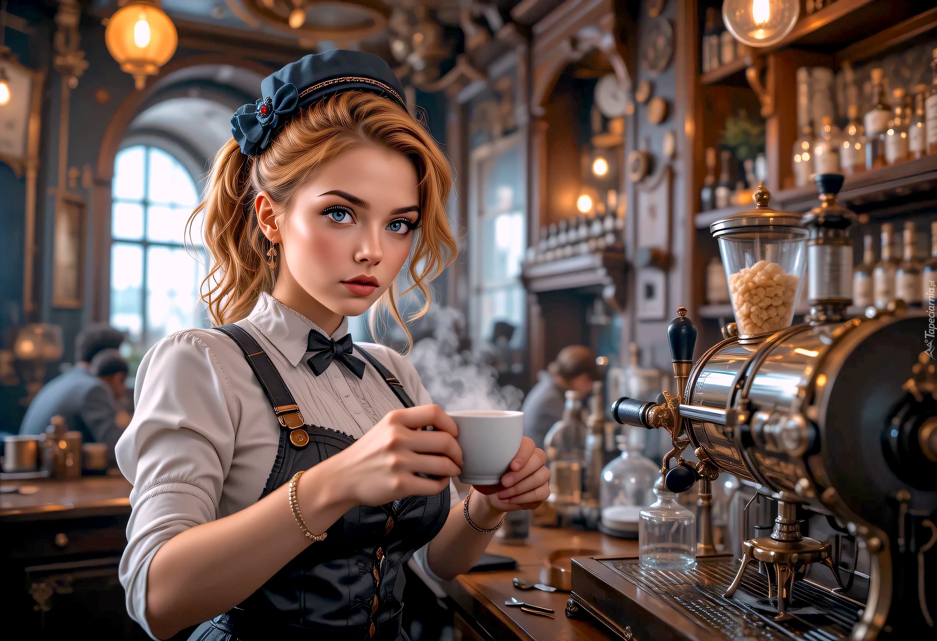 Edytor tapety: Kobieta z filiżanką kawy w kawiarni