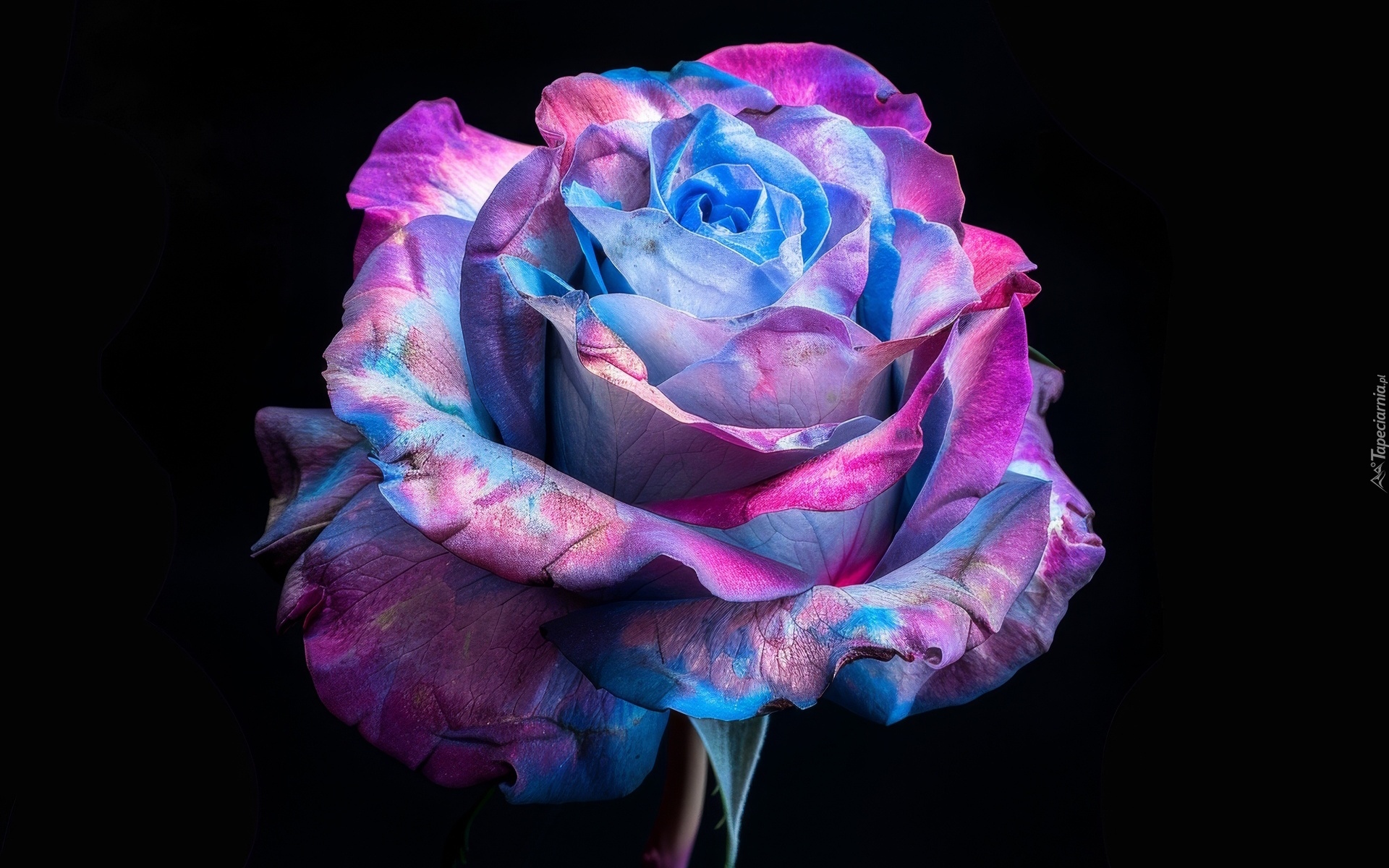 Edytor tapety: Niebiesko-różowa róża na czarnym tle